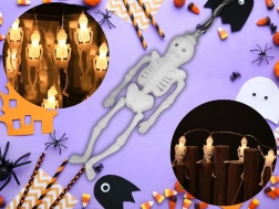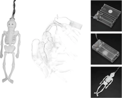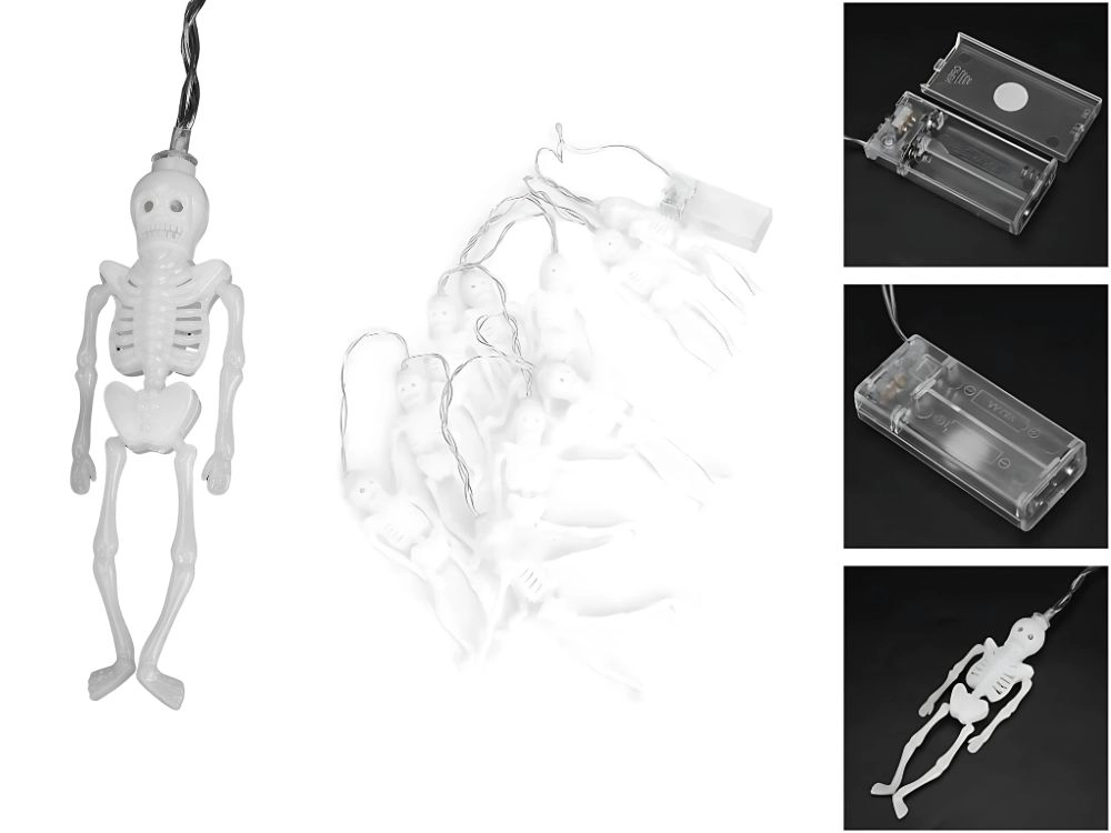 Stilīga gaismas dekorācija, kas acumirklī pārvērš interjeru un aizsargātu ārtelpu noslēpumainā Helovīna vidē. Katram no 10 miniatūrajiem skeletiem ir atsevišķa LED diode, kas nodrošina vienmērīgu gaismas sadalījumu visā virtenes garumā. Silti baltā krāsa rada patīkamu, tomēr spocīgu mirdzumu.