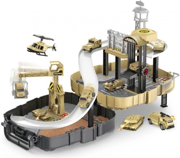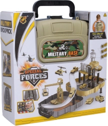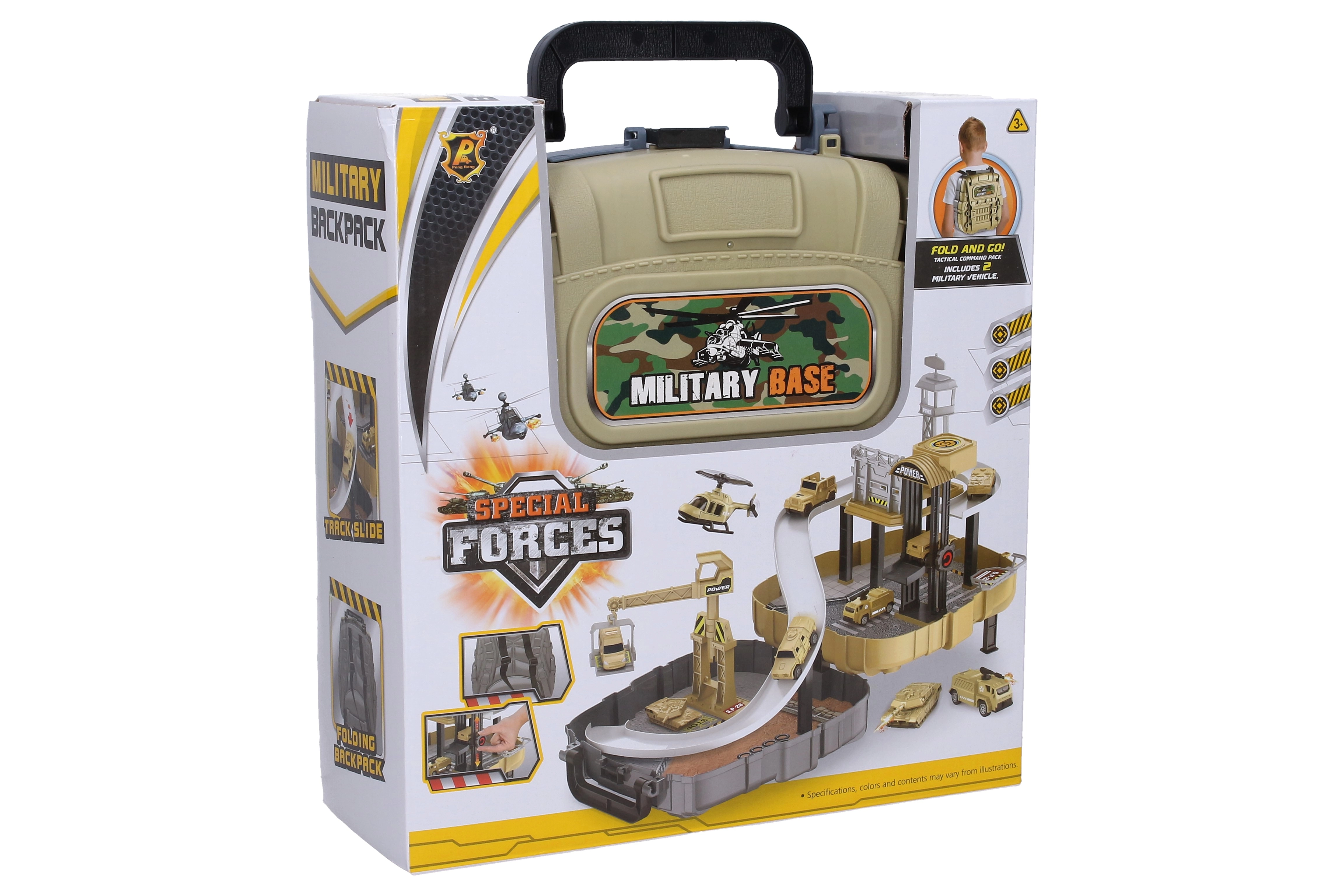Piedzīvojumu komplekts mazajiem armijas entuziastiem: militārā stacija ar trasi, liftu, celtni, heliportu un 2 mašīnītēm praktiskā mugursomā ar siksnām. Ideāli mājās un ceļā, ar attēlu instrukciju vienkāršai salikšanai.