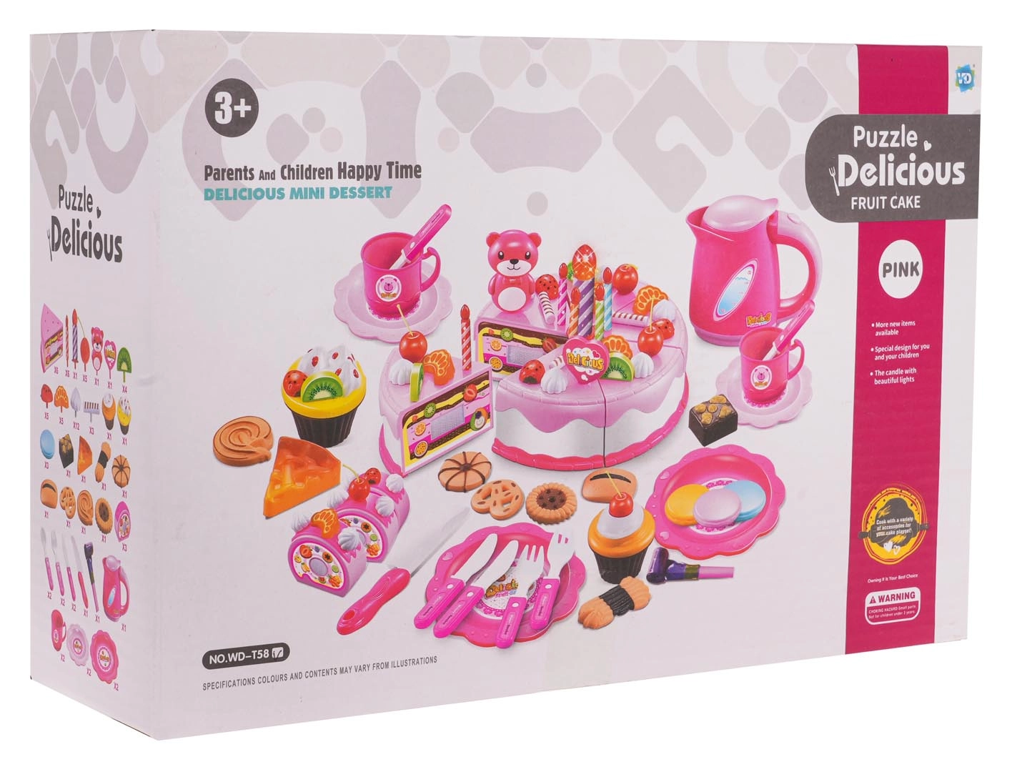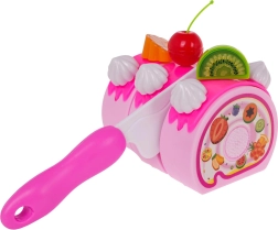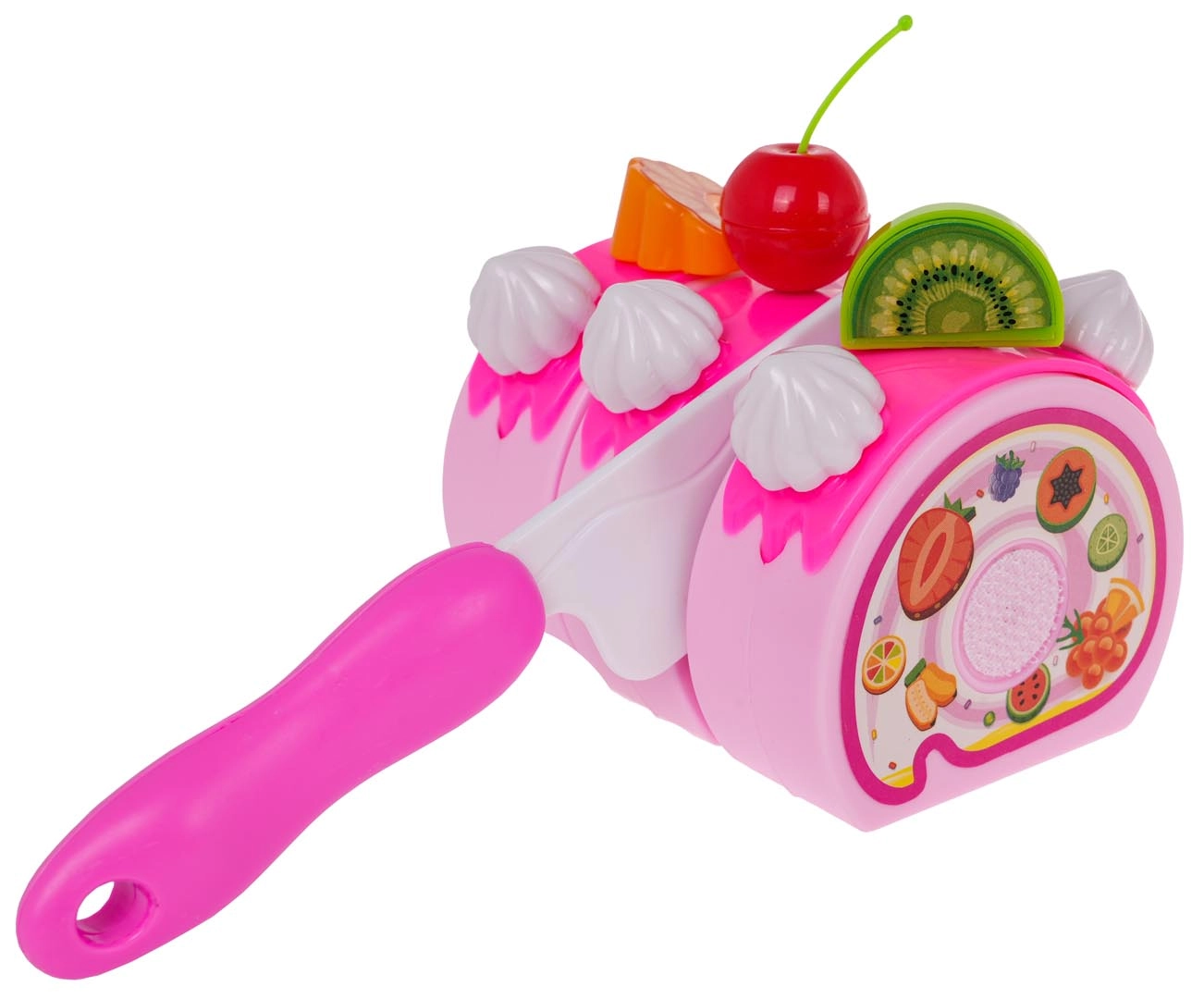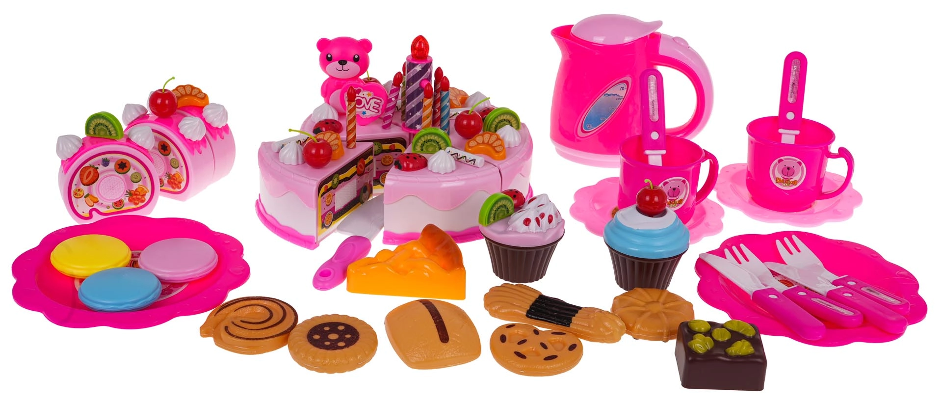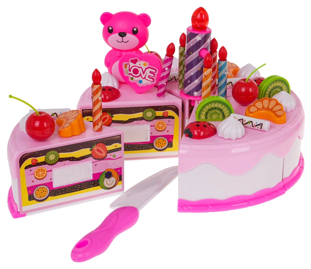 Šis bagātīgi aprīkotais rozā dzimšanas dienas komplekts pārvērtīs istabu mazā konditorejā. Sešdaļīgā torte ar līplenti ir “griežama” ar komplektā iekļauto nazi un to var rotāt ar augļiem, cepumiem un mīlīgiem aksesuāriem. Lielā svece, nospiežot pogu, iedegas divās krāsās (RL41 baterijas ir komplektā), piešķirot svinībām maģisku noskaņu.