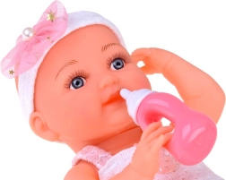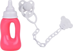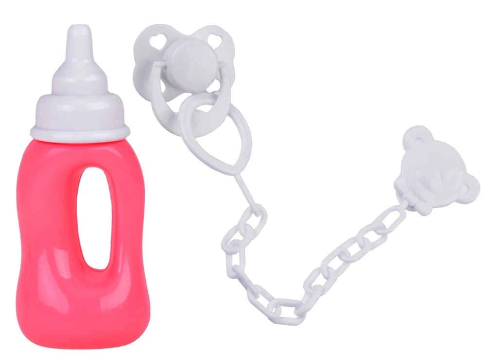 Komplektā ir rozā pudelīte un balts knupītis ar ķēdīti un klipsi – aksesuāri, kas atbalsta reālistisku aprūpi.