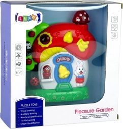 Mīlīgā muzikālā mājiņa aizraus jūsu mazuli uz ilgu laiku. Tā piedāvā dabas skaņas, dzīvnieku balsis (pērtiķītis, pūce, trušītis), melodijas ar dubultu nospiešanu un pavadošus gaismas efektus. Bērni attīsta redzi un dzirdi, iepazīst dzīvniekus un atklāj pasauli aizraujošā veidā.