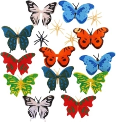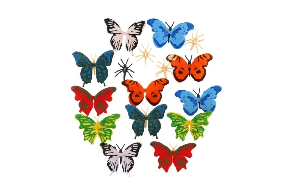Tauriņi ir izgatavoti no izturīgas plastmasas, un pateicoties 7–8 cm izmēram, tos ērti turēt arī mazākām rociņām. Iepakojums praktiskā maisiņā atvieglo pārnēsāšanu un uzglabāšanu, tāpēc tas der ceļojumiem, bērnudārzam, bērnu stūrītim un dārzam.