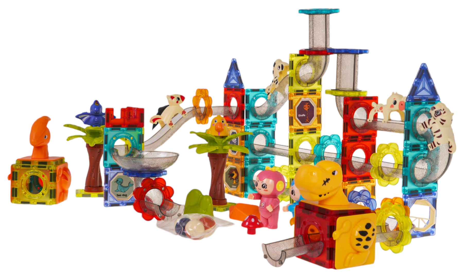 Komplektā ir caurspīdīgi paneļi, caurules, slidkalniņi, bumbiņas un figūriņas. Bērni viegli izveidos savus bumbiņu parkus un ZOO ainiņas.