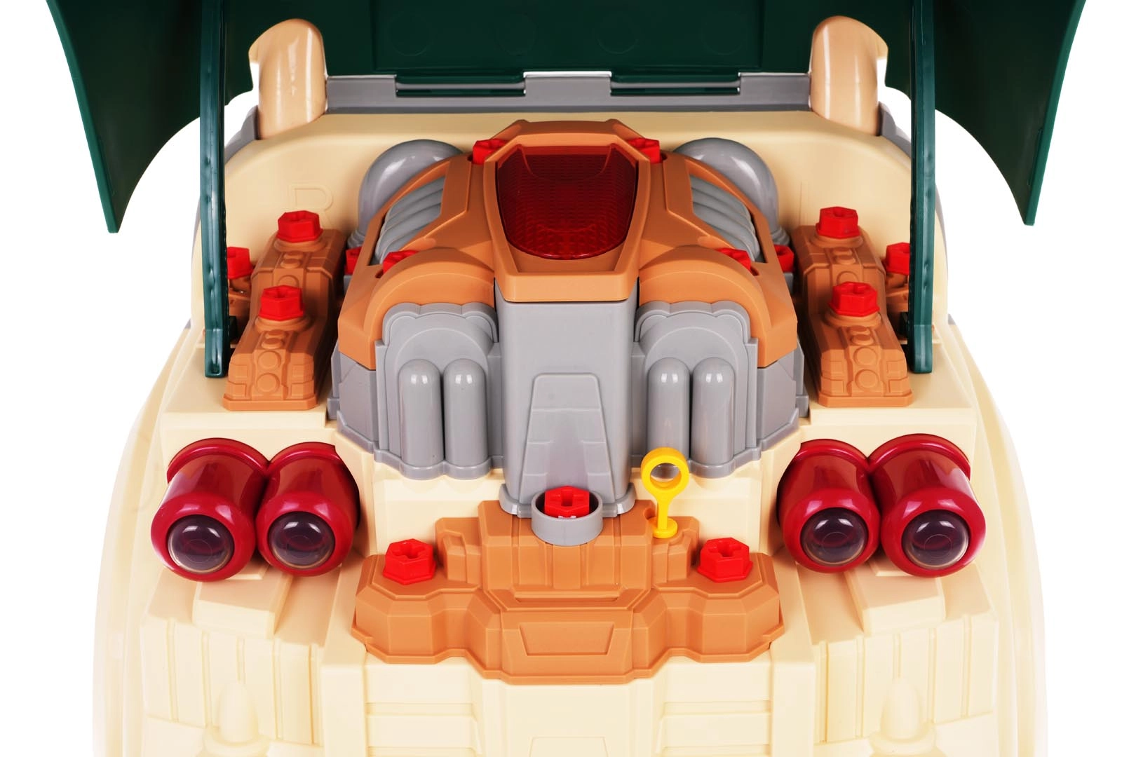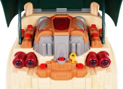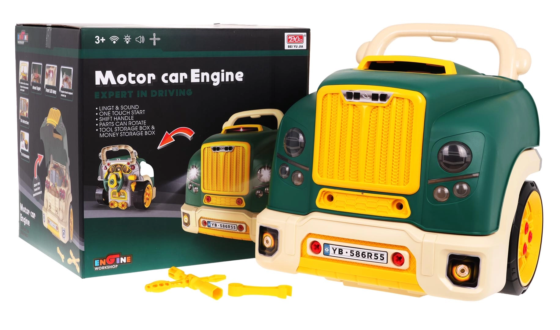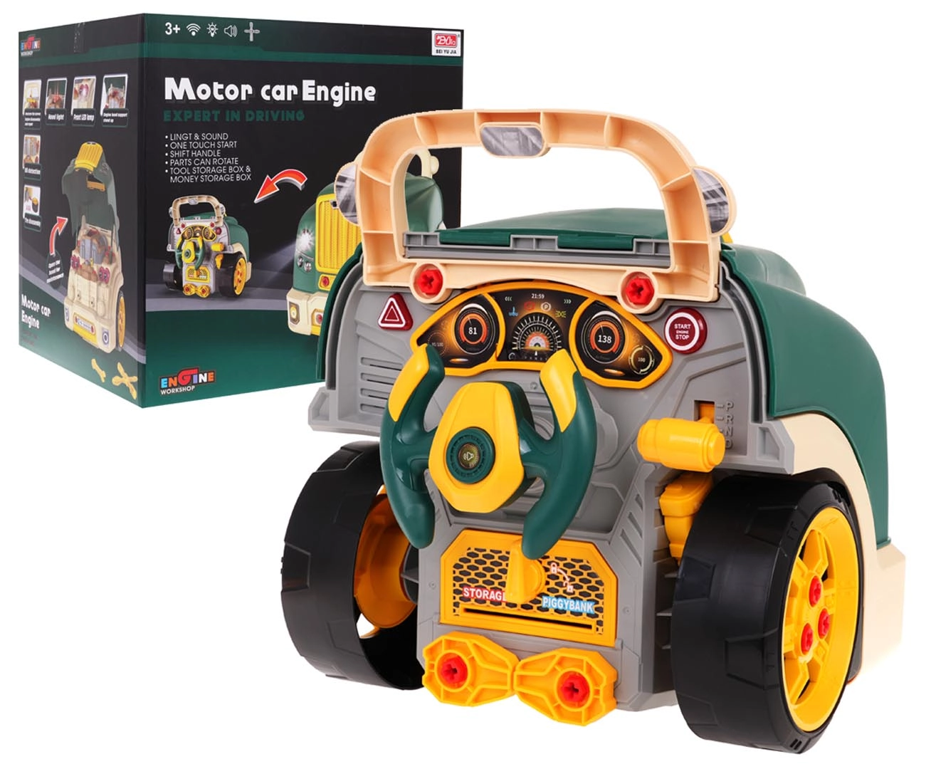 Šī zaļā kravas automobiļa priekšdaļa ar atveramu pārsegu piedāvā bagātīgu interaktīvu izklaidi: izjaucams motors, spīdoši priekšējie lukturi un autentiskas iedarbināšanas, braukšanas un atpakaļgaitas skaņas. Paneļa zonā atradīsiet starta pogu, stūri ar signāltaures pogu, brīdinājuma signālu un pārslēgšanas sviru. Zem stūres ir praktiska glabātuve instrumentiem un skrūvēm, kā arī ērts rokturis vienkāršai pārnēsāšanai.
