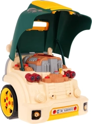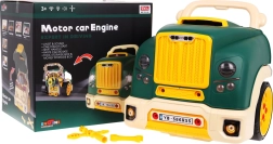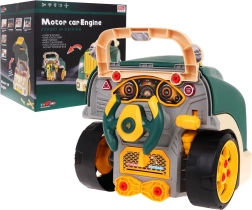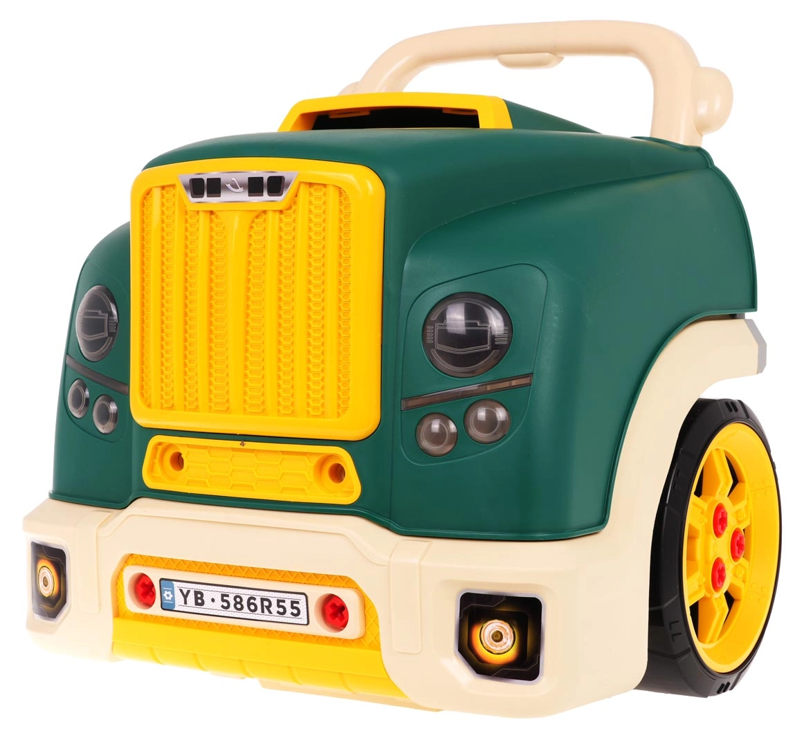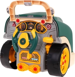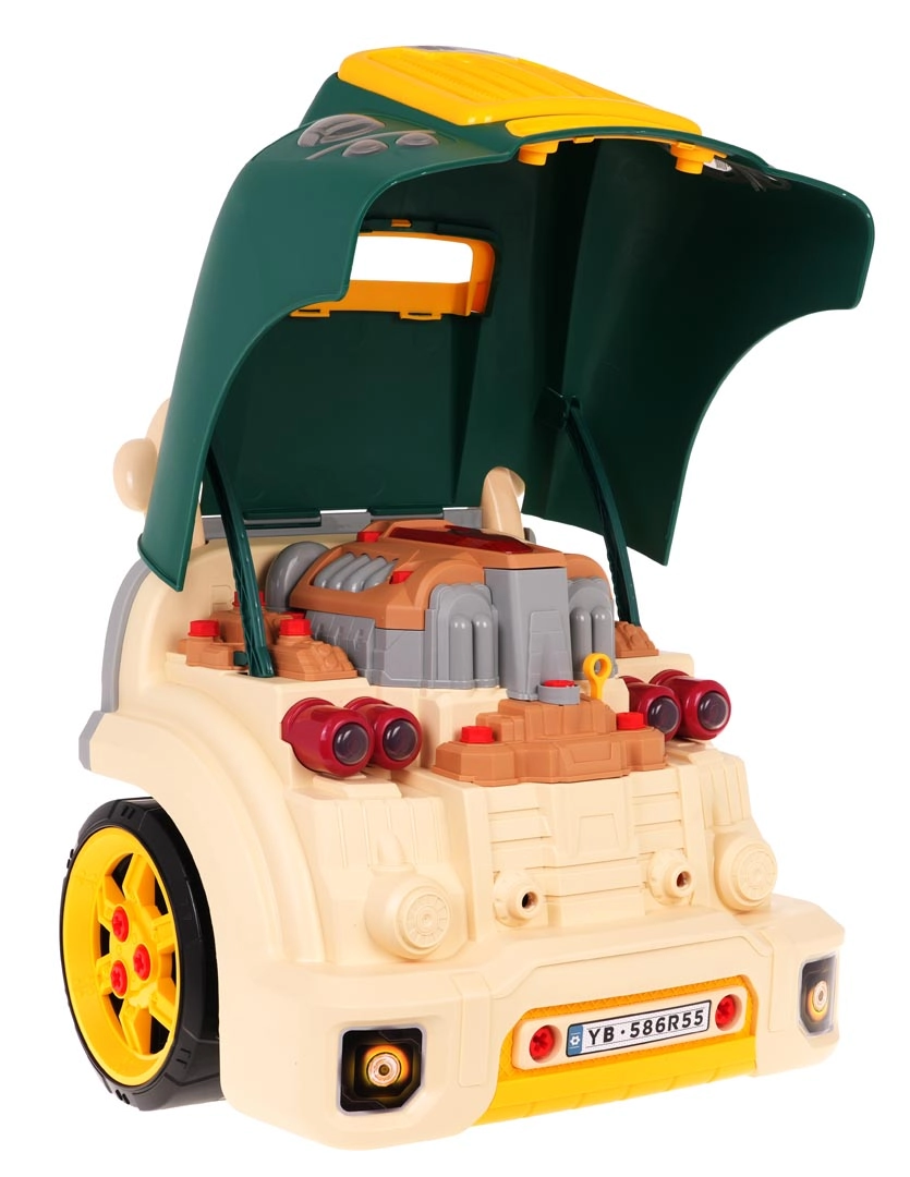 Interaktīvs komplekts mazajiem mehāniķiem kravas auto priekšdaļas formā nodrošina reālistisku spēli ar gaismām, skaņām un izjaucamu motoru. Bērni attīsta smalko motoriku, acu–roku koordināciju un apgūst remontēšanas pamatus, izmantojot skrūves, instrumentus un funkcionālu paneļi ar signāltaures pogu un motora iedarbināšanu.