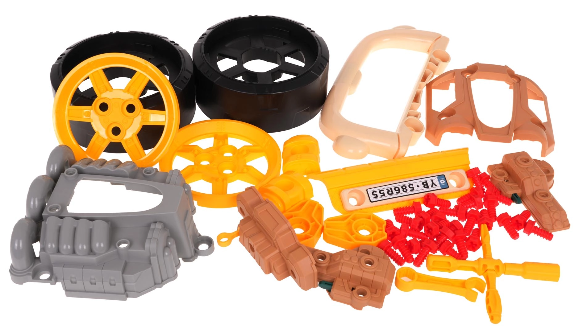 - Auto priekšdaļa ar izjaucamu motoru, riteņi ar diskiem, 31 skrūve, instrumenti, dekoratīvas uzlīmes, instrukcija