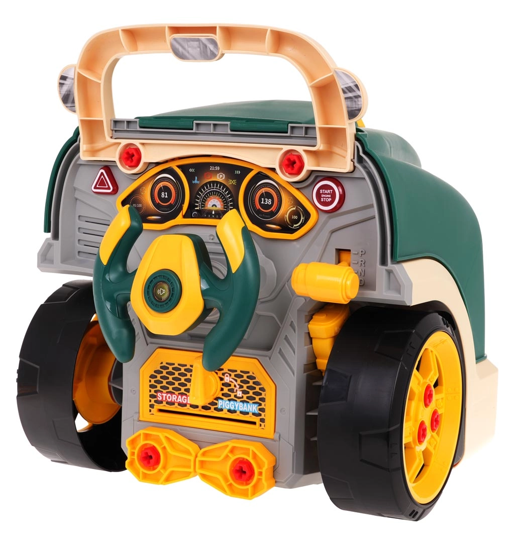 Komplektā ietilpst instrumentu komplekts un daudz skrūvju, lai bērni varētu atkal un atkal montēt un demontēt motoru un riteņus. Spēle veicina manuālās prasmes, radošumu un tehnisko domāšanu. Barošana ar 3× AA 1,5 V baterijām (nav iekļautas komplektā).