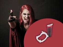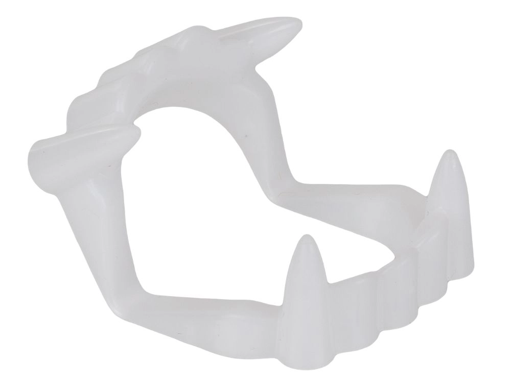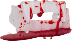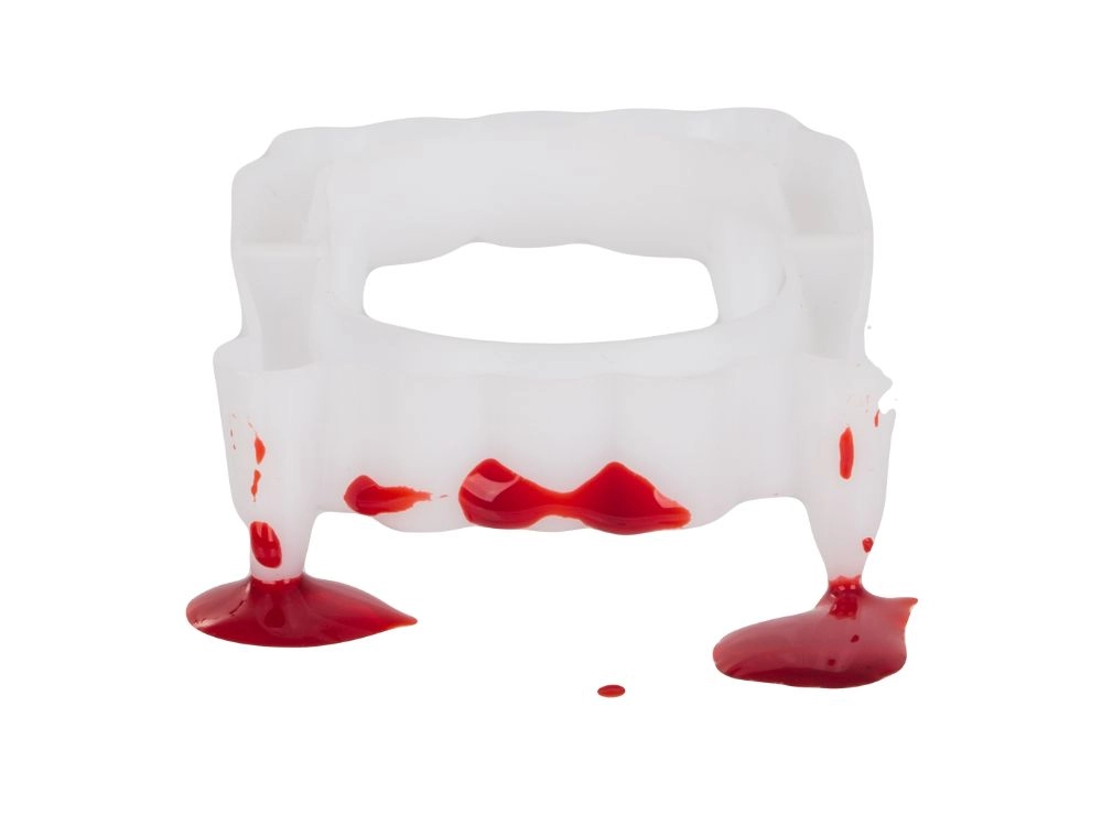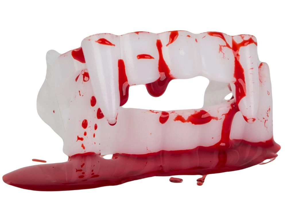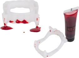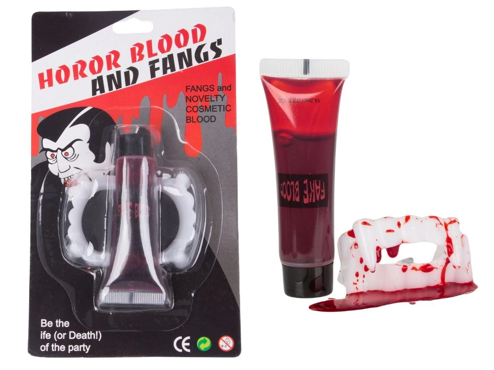 Pārvērties par īstu vampīru dažu sekunžu laikā. Balti plastmasas ilkņi ar sarkaniem akcentiem atdarina svaigas asinis, un kopā ar tūbiņu neīsto asiņu veido autentisku šausmu efektu grima un kostīmu vajadzībām. Piemērots Helovīnam, masku ballēm, tematiskiem vakariem un kino vai foto projektiem.