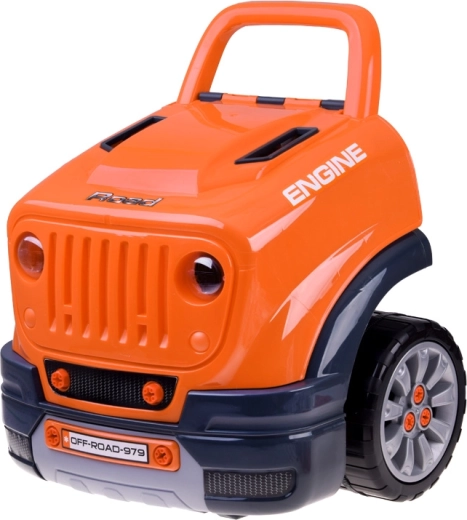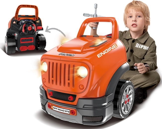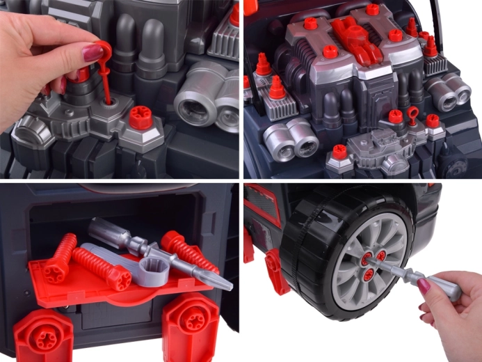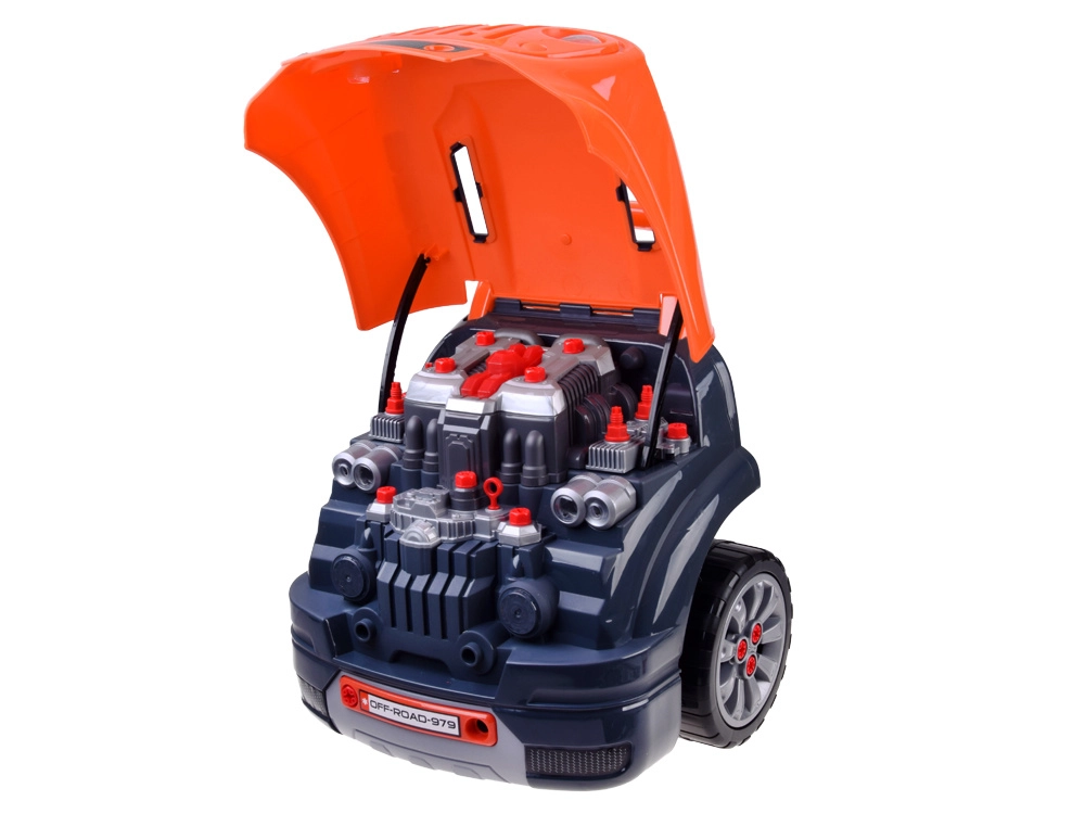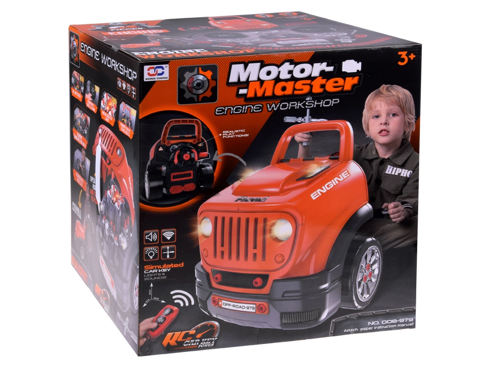 Interaktīvais darbnīcas komplekts mazajiem mehāniķiem reālistiski atdarina darbu autoservisā. Bērni var atvērt pārsegu, izjaukt un atkal salikt izņemamo motoru, mainīt riteņus un dekoratīvos vāciņus, izmēģināt iedarbināšanu ar pogu un izmantot skaņas un gaismas efektus – no skaņas signāla un atpakaļgaitas līdz trauksmei un avārijas gaismām.