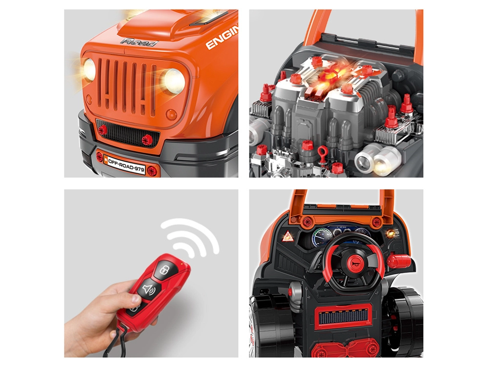 Darbīgi LED priekšējie lukturi, avārijas brīdinājuma gaismas un realistiskas skaņas: iedarbināšana, motora darbība, atpakaļgaita, skaņas signāls, trauksme un durvju aizslēgšana/atslēgšana.