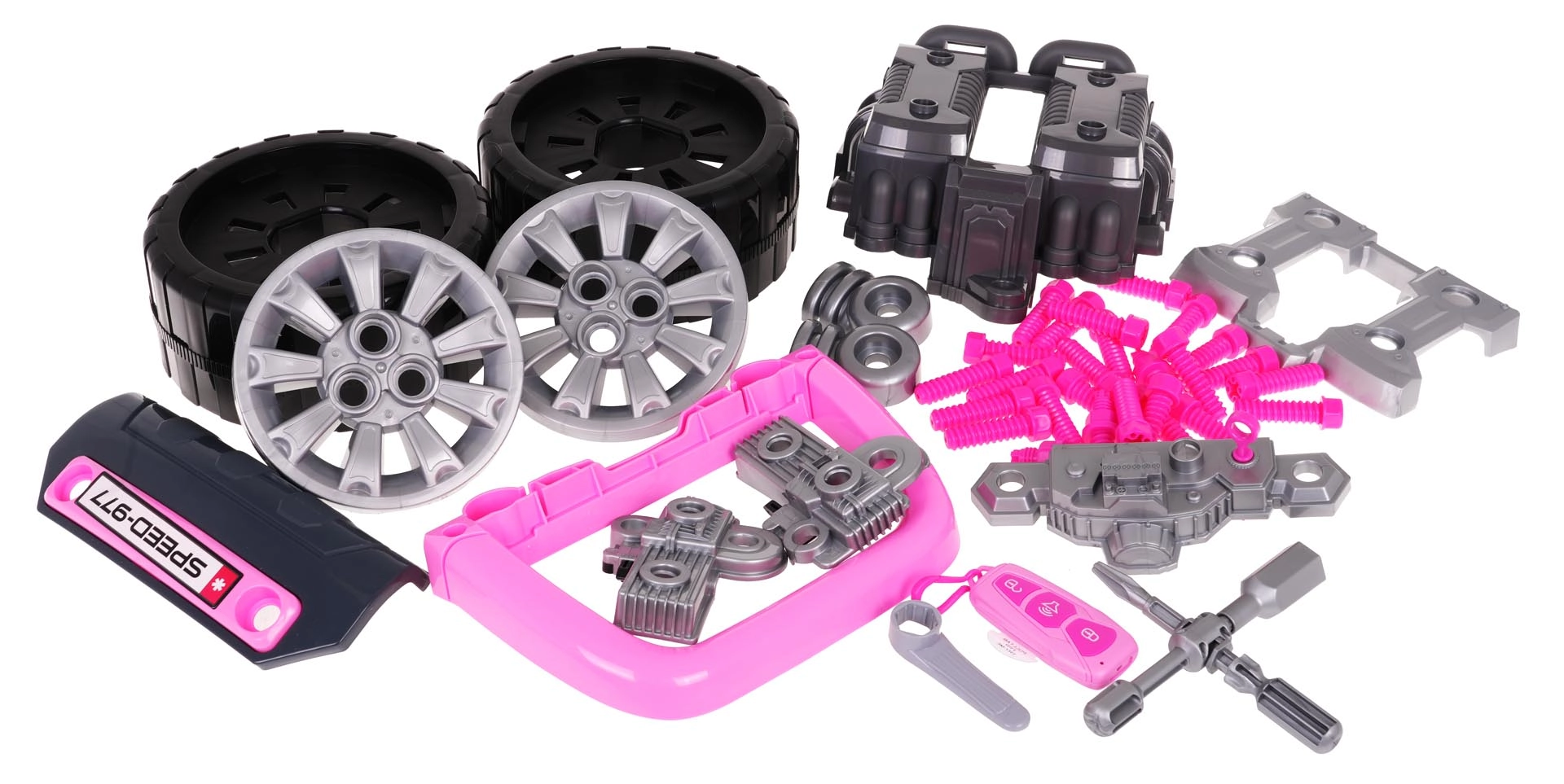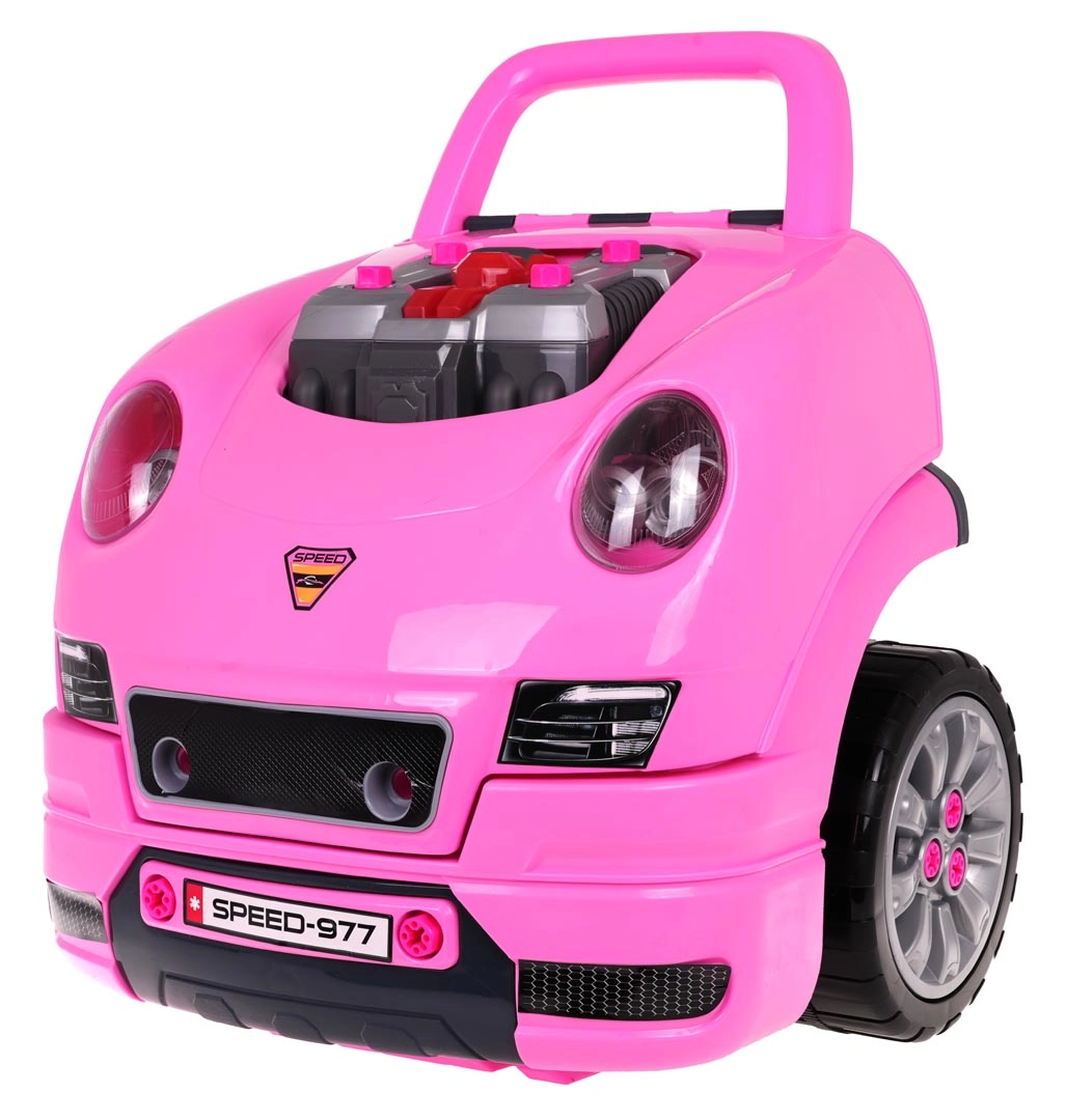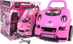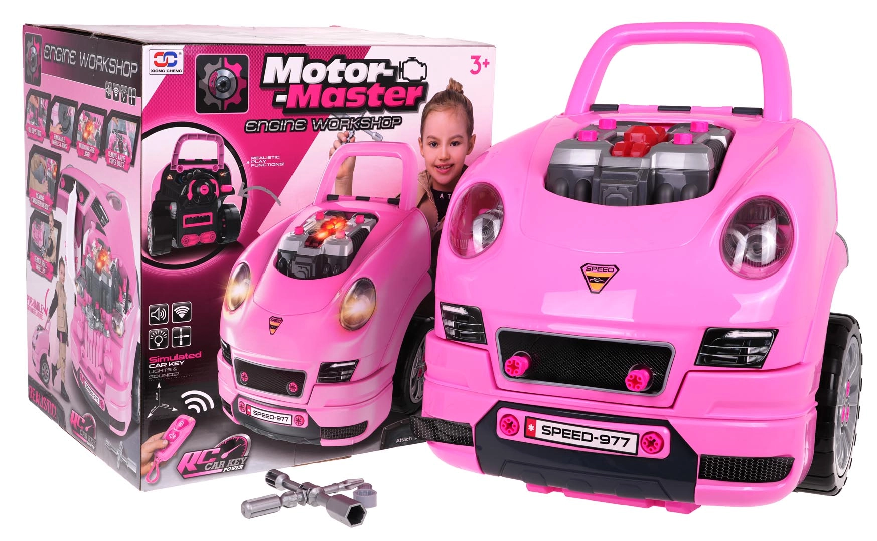 Tālvadības pults atslēgu formā ieslēdz spīdošos priekšējos lukturus un motora apgaismojumu, kā arī atskaņo durvju bloķēšanas/atbloķēšanas skaņas un taurīti. Ērts rokturis atvieglo pārnēsāšanu, bet nodalījums zem stūres ietilpina visas skrūves, darbarīkus un piederumus. Komplekts attīsta prasmes, fantāziju un rotaļīgā veidā māca mehānikas pamatus.