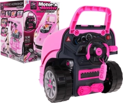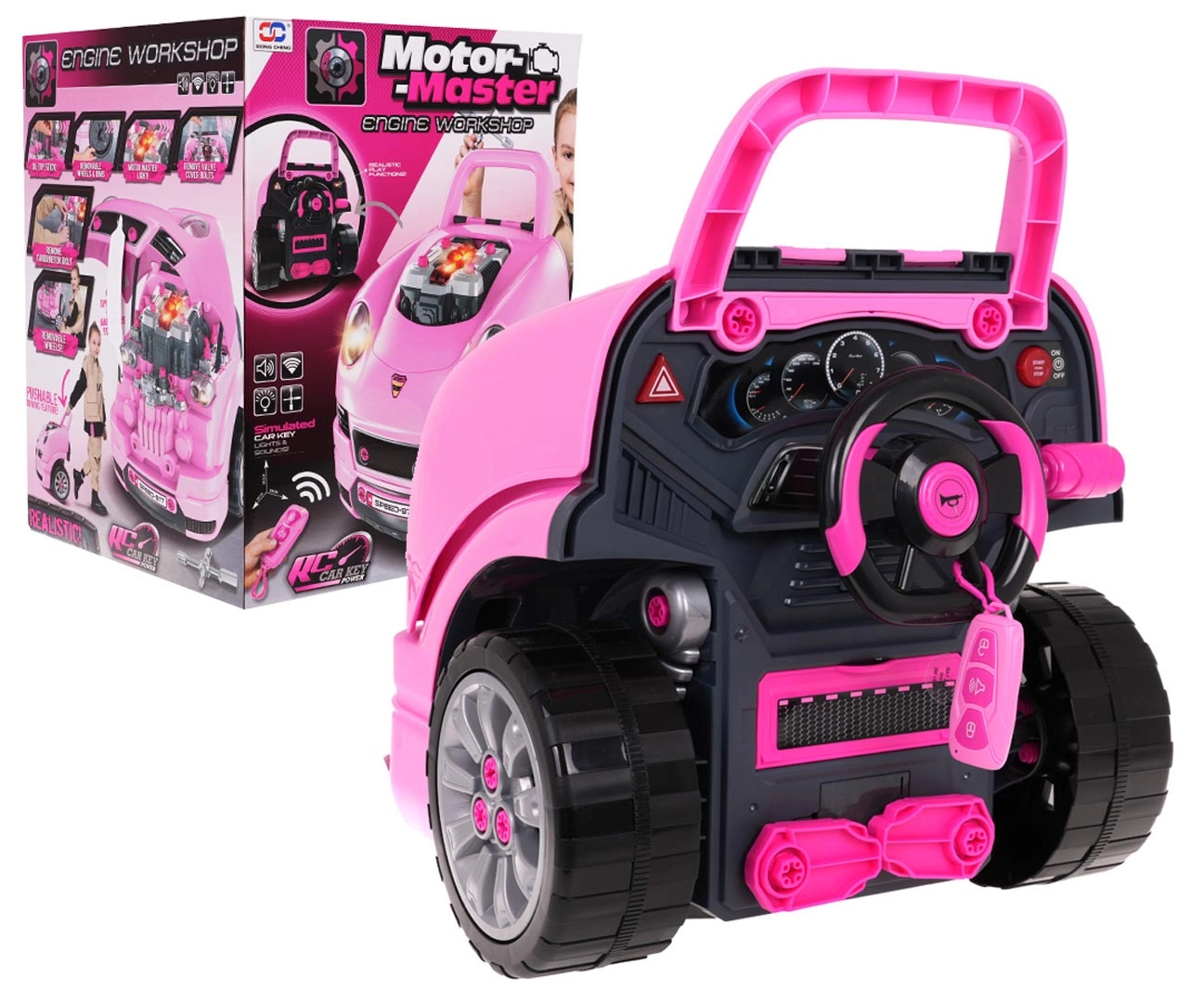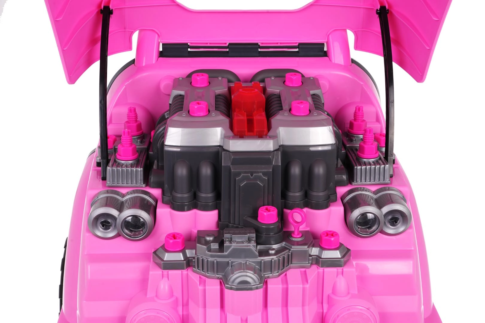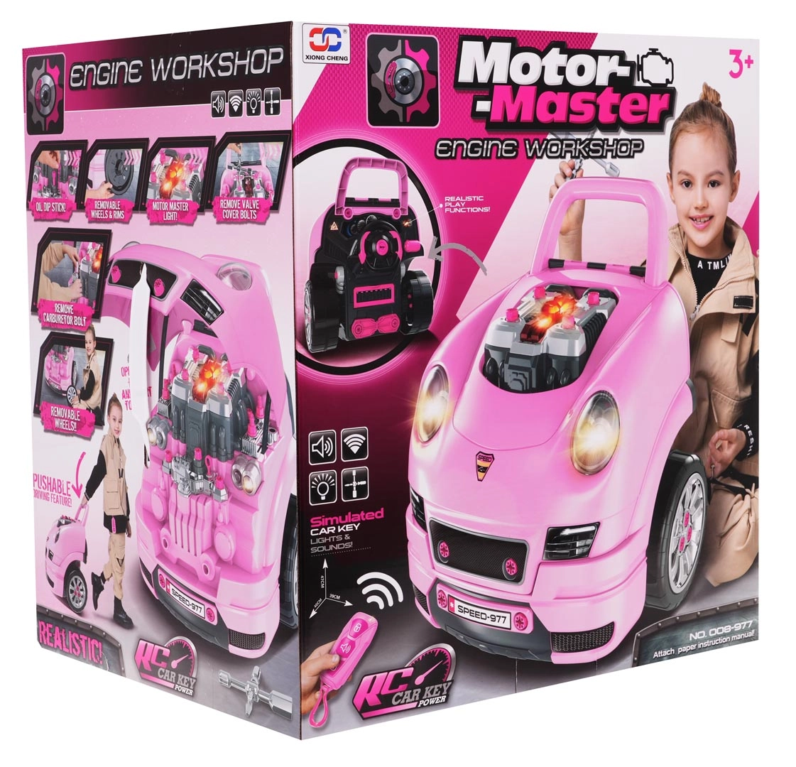 Interaktīva transportlīdzekļa priekšdaļa ar instrumentu paneli un automātisku “pārnesumu” sviru nodrošina bērniem reālistisku braukšanas un servisa pieredzi. Pēc starta nospiešanas atskan iedarbināšanas skaņa, bet braukšanas un atpakaļgaitas laikā ieslēdzas atbilstoši efekti. Zem pārsega slēpjas liels izjaucams motors, kur mazie mehāniķi var mainīt “sveces”, riteņus un citas sastāvdaļas.
