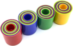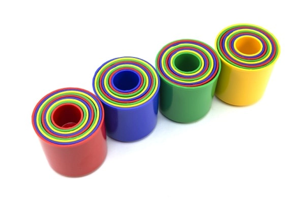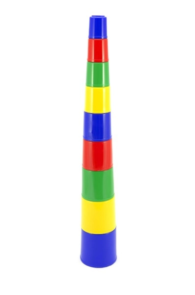 Katrai krūzītei ir atšķirīga krāsa un izmērs. Būvējot torni vai ievietojot tās vienu otrā, bērni apgūst krāsu atšķiršanu, kārtošanu pēc izmēra un secīgumu.