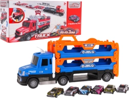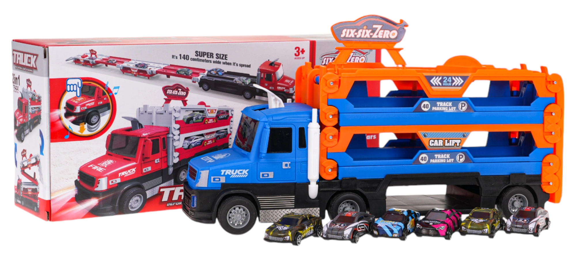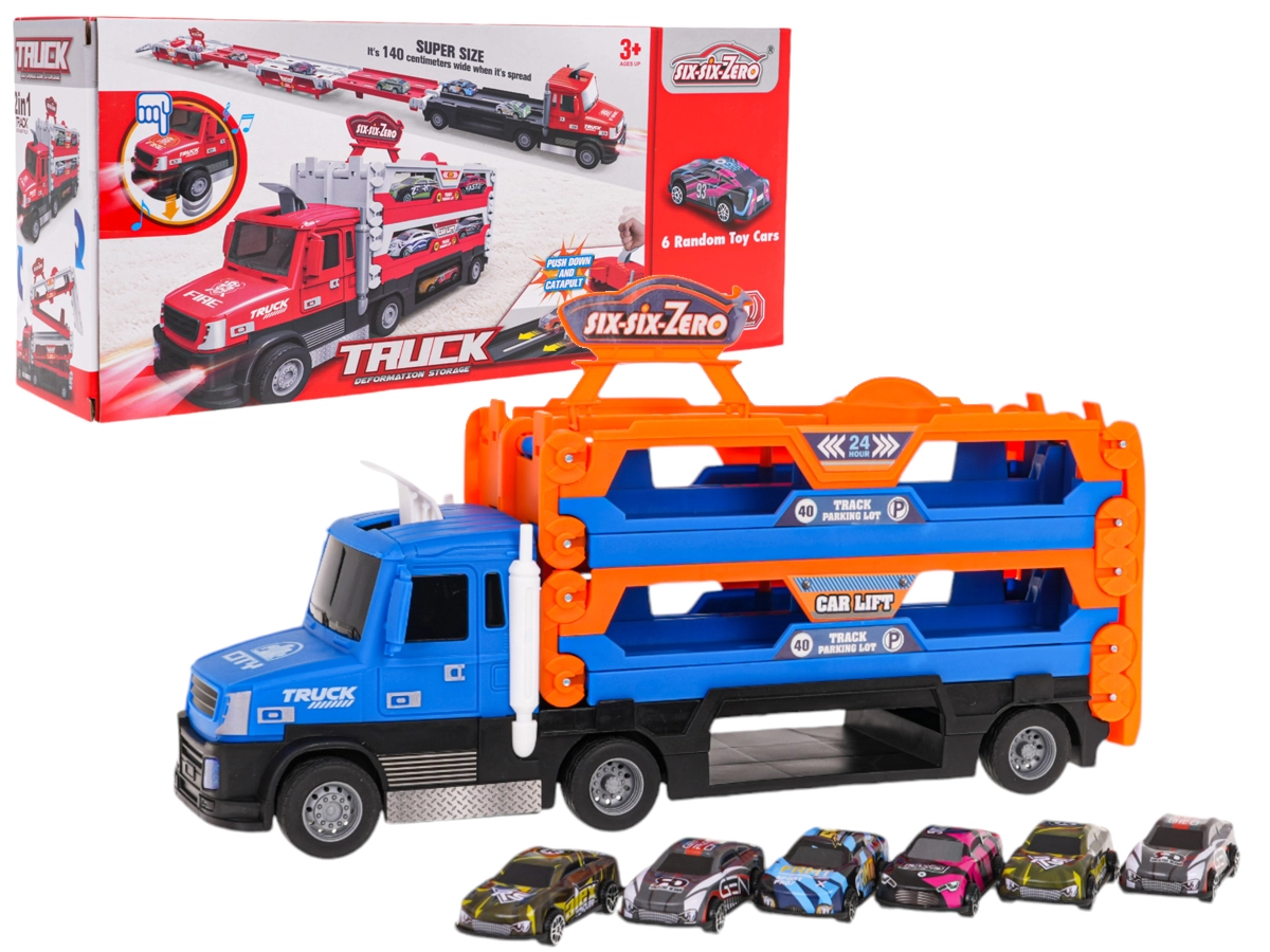 Interaktīva, trīslīmeņu kravas automašīna ar katapultu bērniem no 3 gadiem apvieno gan uzglabāšanu, gan sacensības. Atverot tā pārvēršas līdz pat 140 cm garā sacīkšu trasē, un pateicoties gumijas riepām ir stabila braukšanas laikā. Komplektā ir 6 metāla mašīnītes (1:64), gaismas un skaņas efekti un palaidējs dinamiskai spēlei.