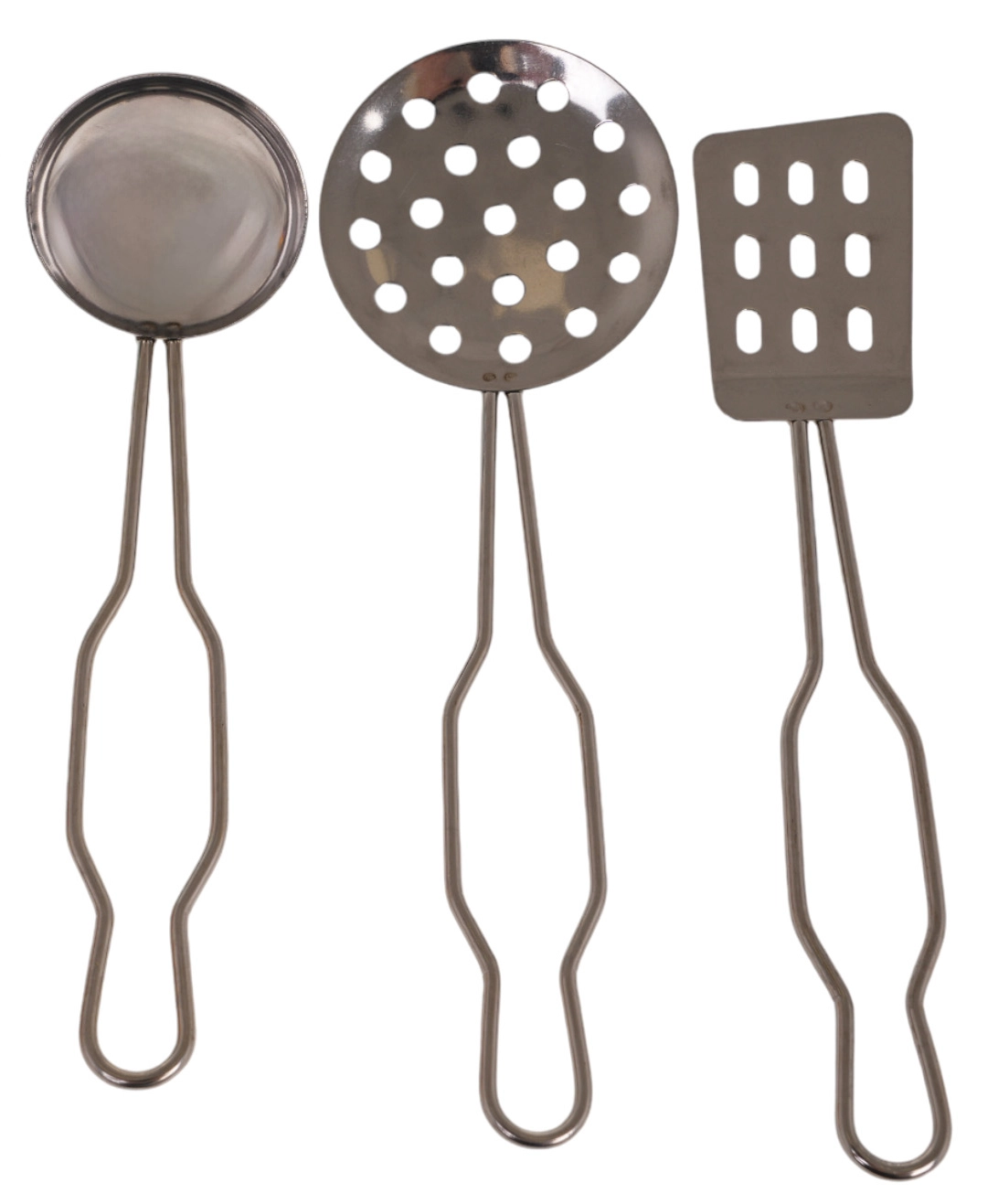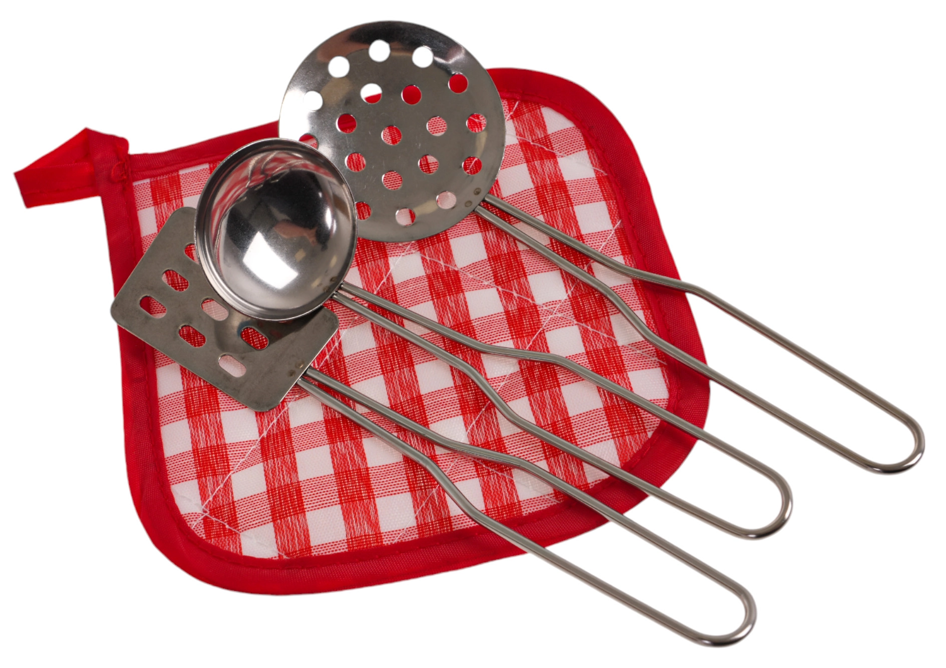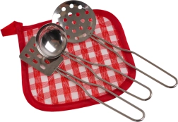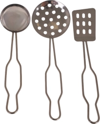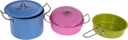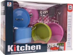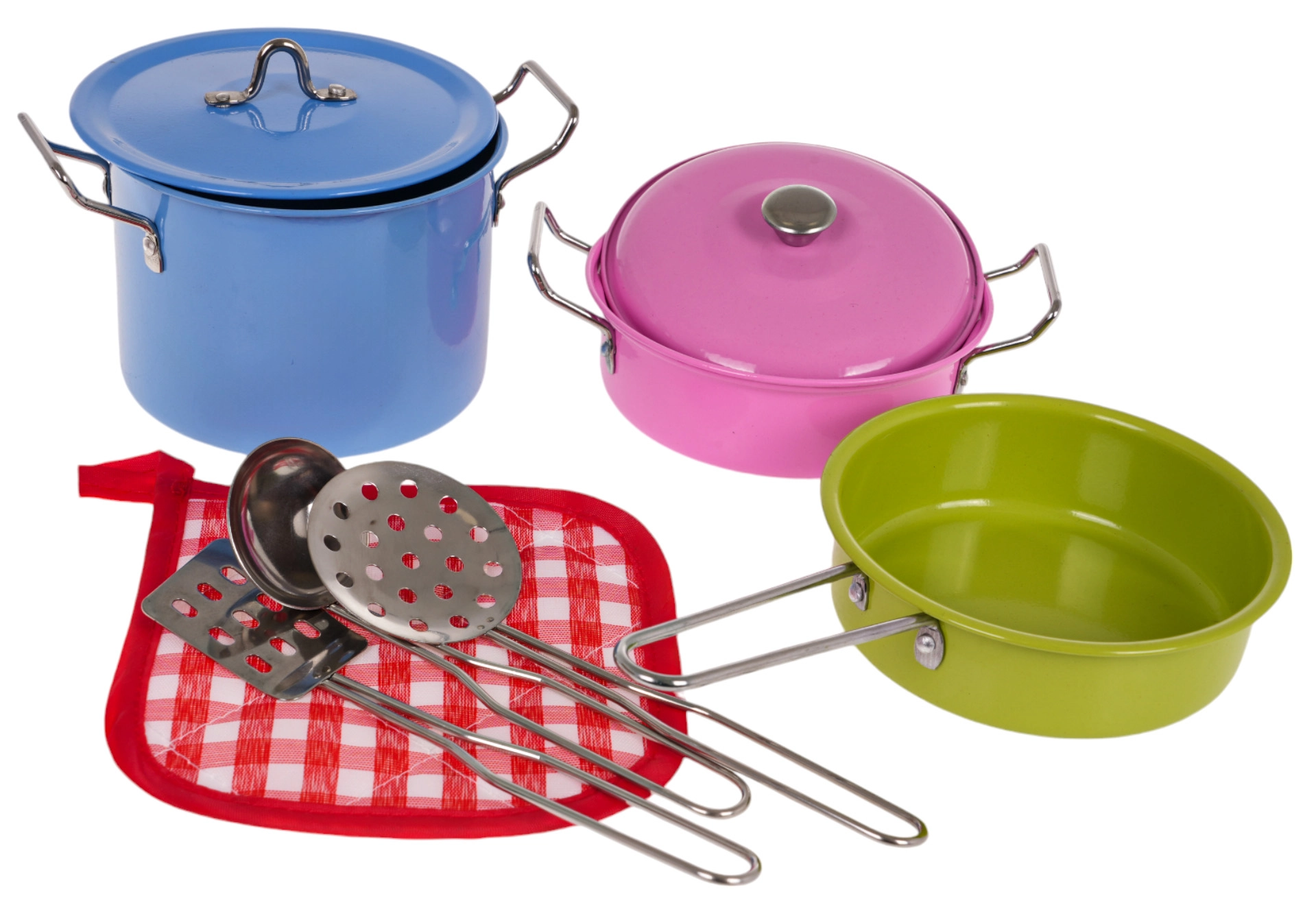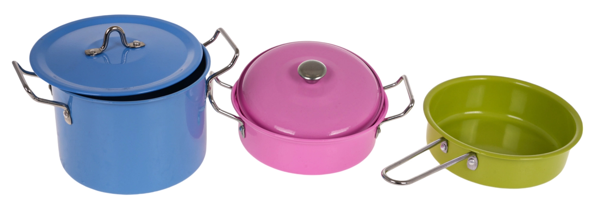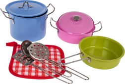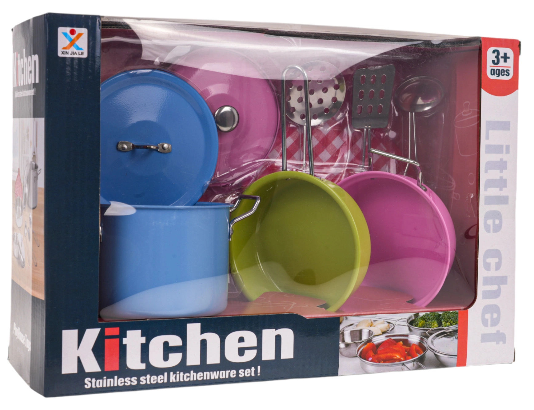 Ieprieciniet sava bērna rotaļas ar šo skaisto krāsaino virtuves piederumu komplektu. Tas ietver skaistu zilu katlu ar rokturiem un vāku, rozā katlu ar rokturiem un vāku, zaļu pannu un dažādus virtuves piederumus — ideāls komplekts jaunajiem pavāriem.