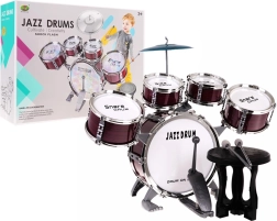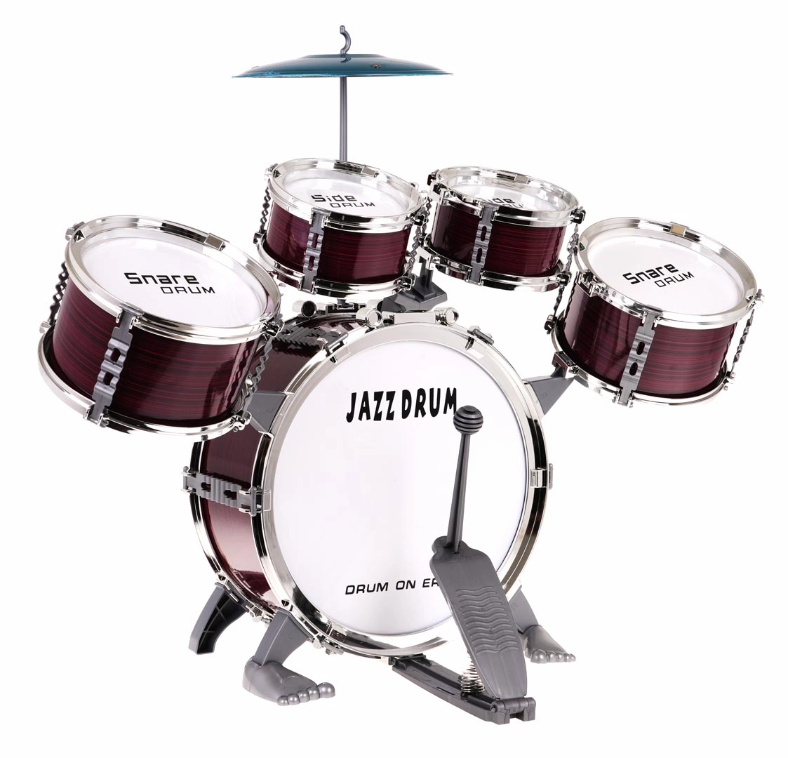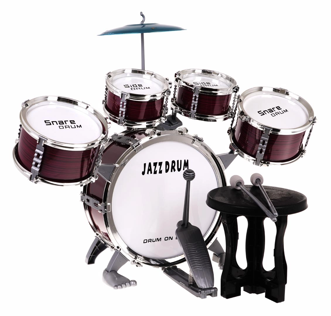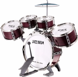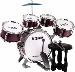 Ietver visas nepieciešamās sastāvdaļas: piecas bungas, šķīvi, vālītes un krēsliņu.
