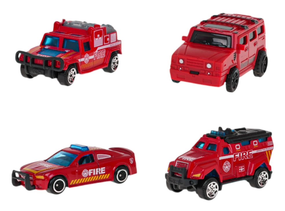 - Iekļauti 4 ugunsdzēsēju auto, viens no tiem darbojas ar 1 x AA 1,5 V bateriju (nav iekļauta komplektā).