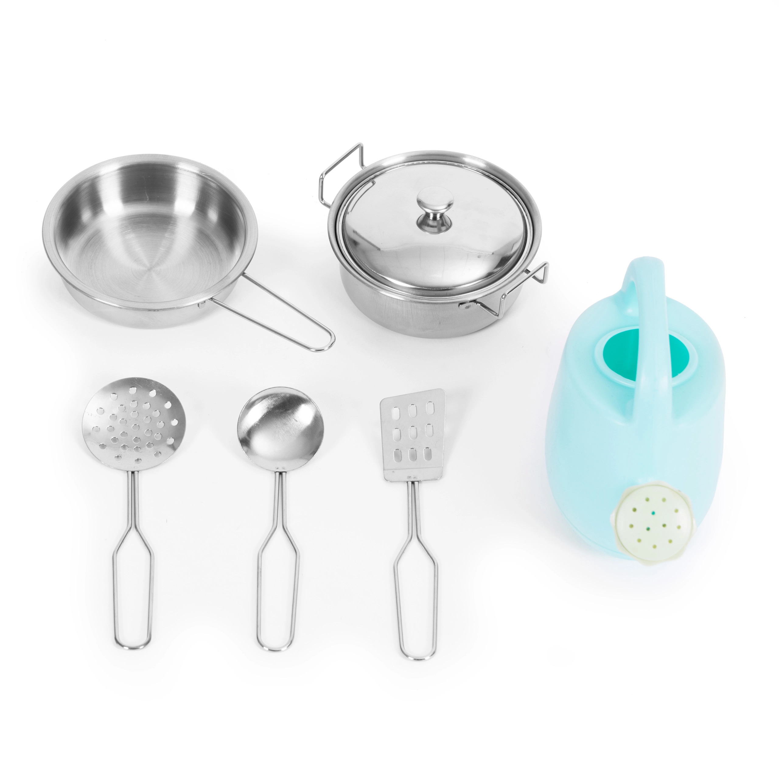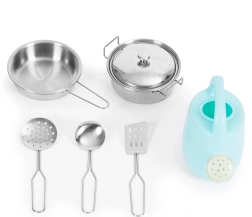 Komplektā ir katls ar vāku, panna, divi lāpstiņu veidi, kausiņš un kanniņa – viss gatavs mazajiem kulinārajiem eksperimentiem.