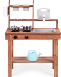 Šī izturīgā dubļu virtuve ienes reālistisku gatavošanu bērnu pasaulē. Pateicoties tvertnei ar darbojošu krānu, mazajiem pavāriem ir pieejams īsts ūdens, divi plīts degļi ar griežamām pogām un bagātīgi metāla piederumi. Dabīgais egles koks izturēs spēles dārzā, terasē un arī bērnu istabā.