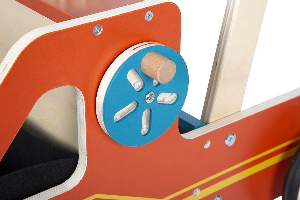 Par izklaidi un sīkās motorikas attīstību rūpējas funkcionālas detaļas: zobrati, griežams rats ar kloķi un kustīgas zilas gaismas. Izņemamais filca grozs kalpo kā uzglabāšanas vieta rotaļlietām un sīklietām, lai katra “izsaukuma” brīdī viss būtu ātri un kārtīgi.