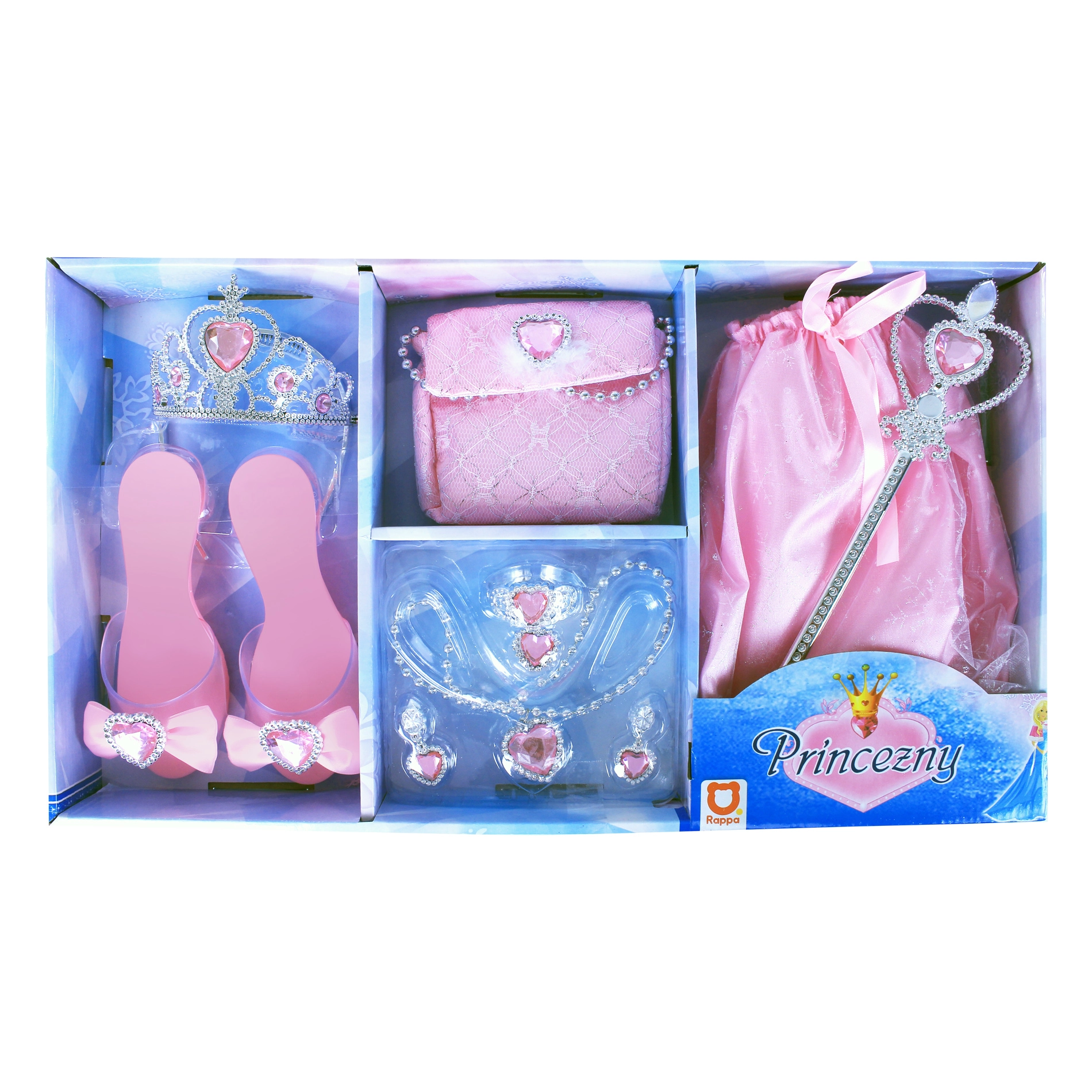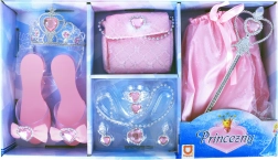 Ekskluzīvs rozā komplekts mazajām princesēm, kas pilnveidos jebkuru tērpu līdz pilnībai. Satur svārciņus, kurpītes, kroni, zizli, auskarus, gredzenu, kaklarotu un somiņu – viss skaisti saskaņots un rotāts ar rozā akmentiņiem maksimālam efektam. Ideāli piemērots karnevālam, svinībām un rotaļām mājās. Piepildi savu tērpu ar brīnišķīgiem aksesuāriem vienotā stilā un izbaudi mirdzošu princeses izskatu.