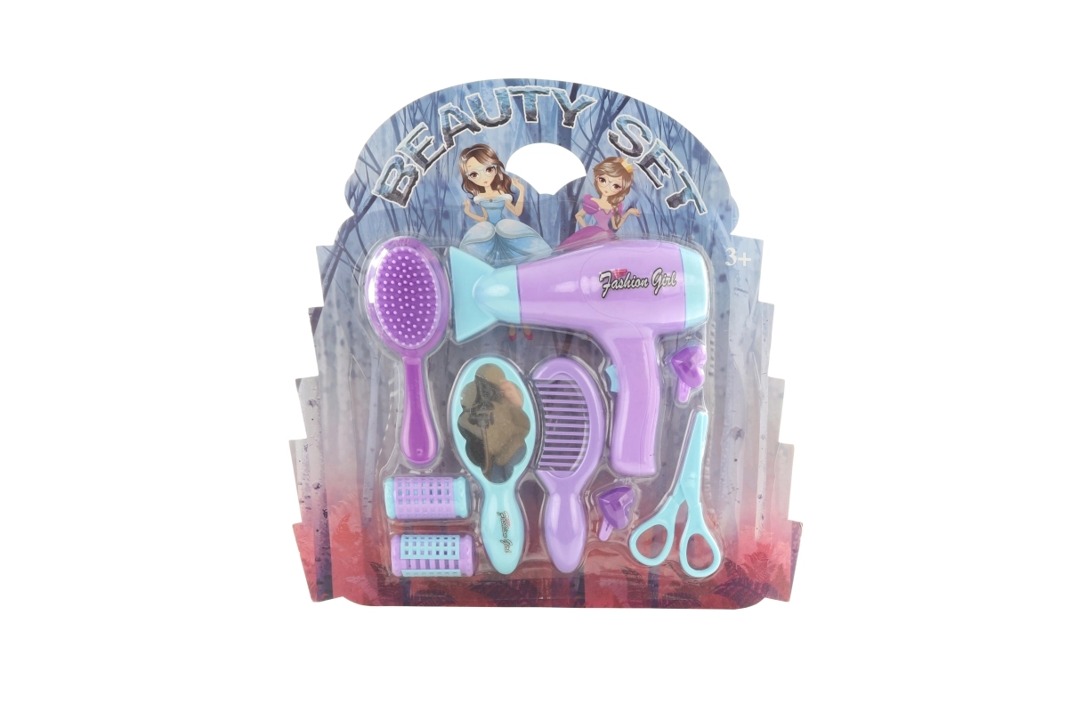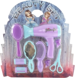 Izklaidējošs friziera komplekts mazajiem stilistiem no 3 gadu vecuma ietver bateriju fēnu aptuveni 16 × 15 cm izmērā, ķemmi, birsti, 2 rullīšus, 2 sprādzes un šķēres. Viss ir izgatavots no izturīgas plastmasas un piemērots drošai bērnu spēlei. Fēns darbojas ar 2 AA baterijām.