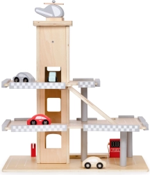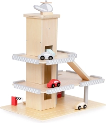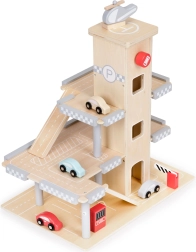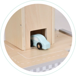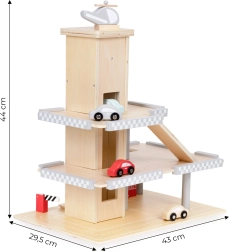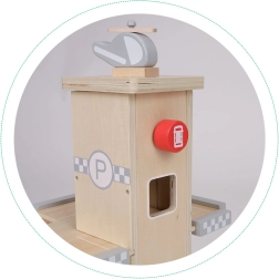 Šī stilīgā koka garāža sajūsminās ikvienu bērnu, kurš mīl auto un radošas rotaļas. Pateicoties trīs līmeņiem, plūdenām rampām un liftam, kas apstājas katrā stāvā, tā sniedz stundām ilgu izklaidi un attīsta sīko motoriku un iztēli.