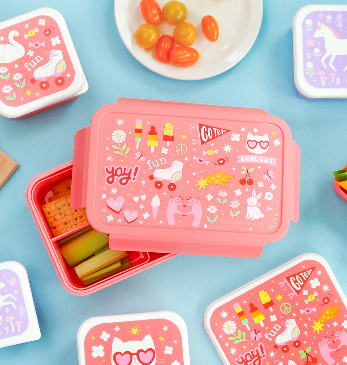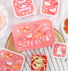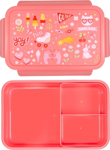 Mīlīga pusdienu kastīte koraļļaini rozā krāsā ar izklaides motīvu ir ideāla skolai un izbraucieniem. Tai ir hermētiski aizspiežams vāks un izņemams paliktnis ar divām nodalījumiem kārtīgai uzkodu sakārtošanai. Vieglas, izturīgas un krāsainām maltītēm gatavas – bērniem tās patiks.