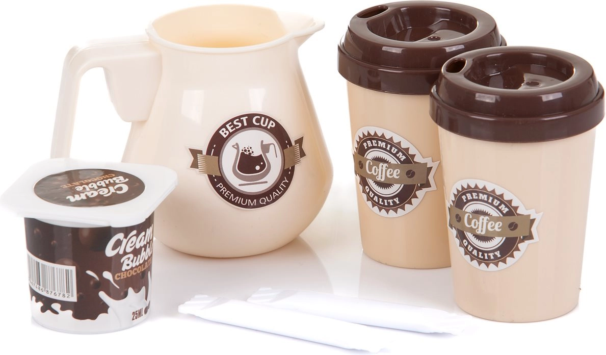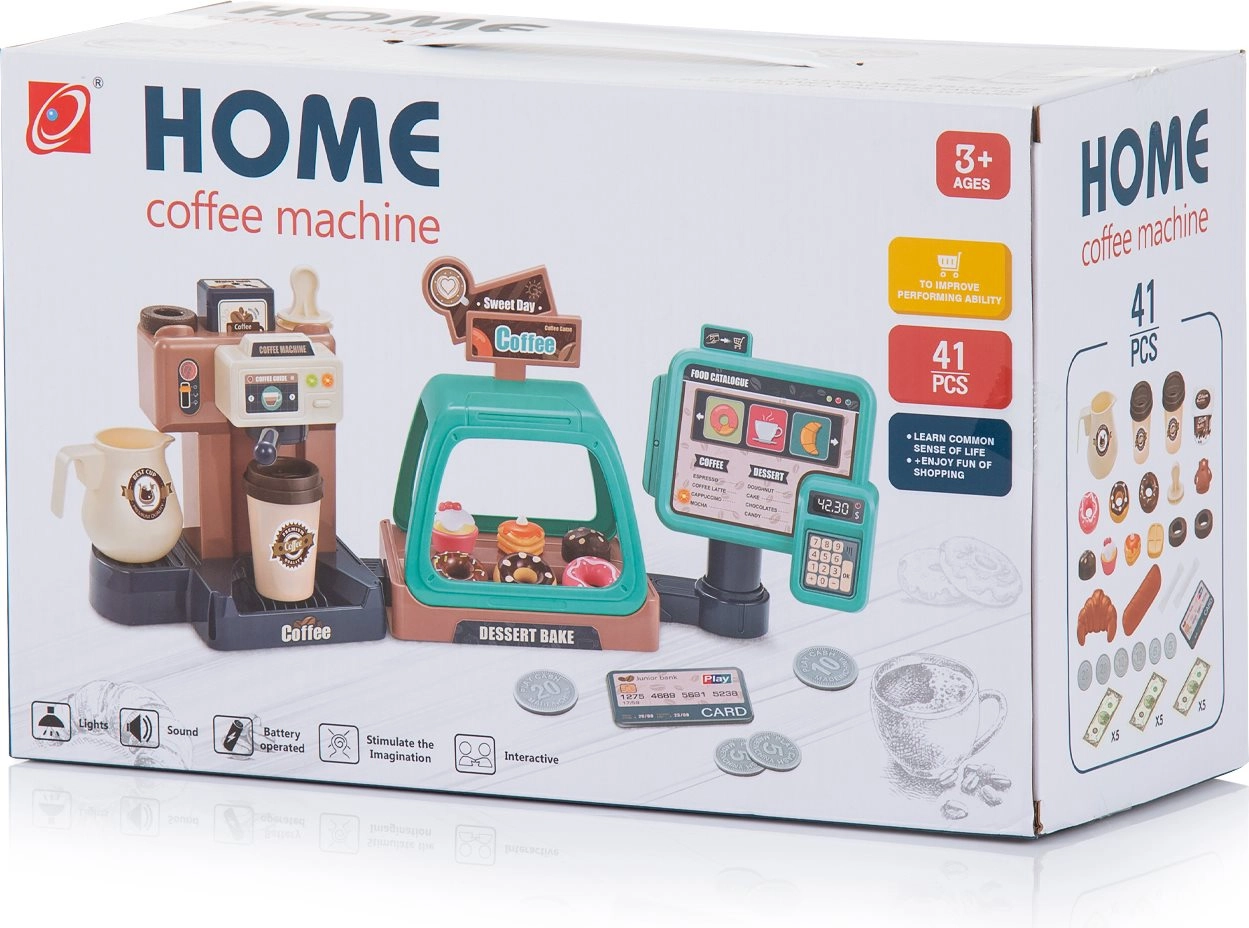 Komplektā ietilpst 41 dažāds piederumu gabals, tostarp kafijas automāts, tasītes, kafijas presēšanas rīks, monētas, banknotes, kase un stends desertiem.