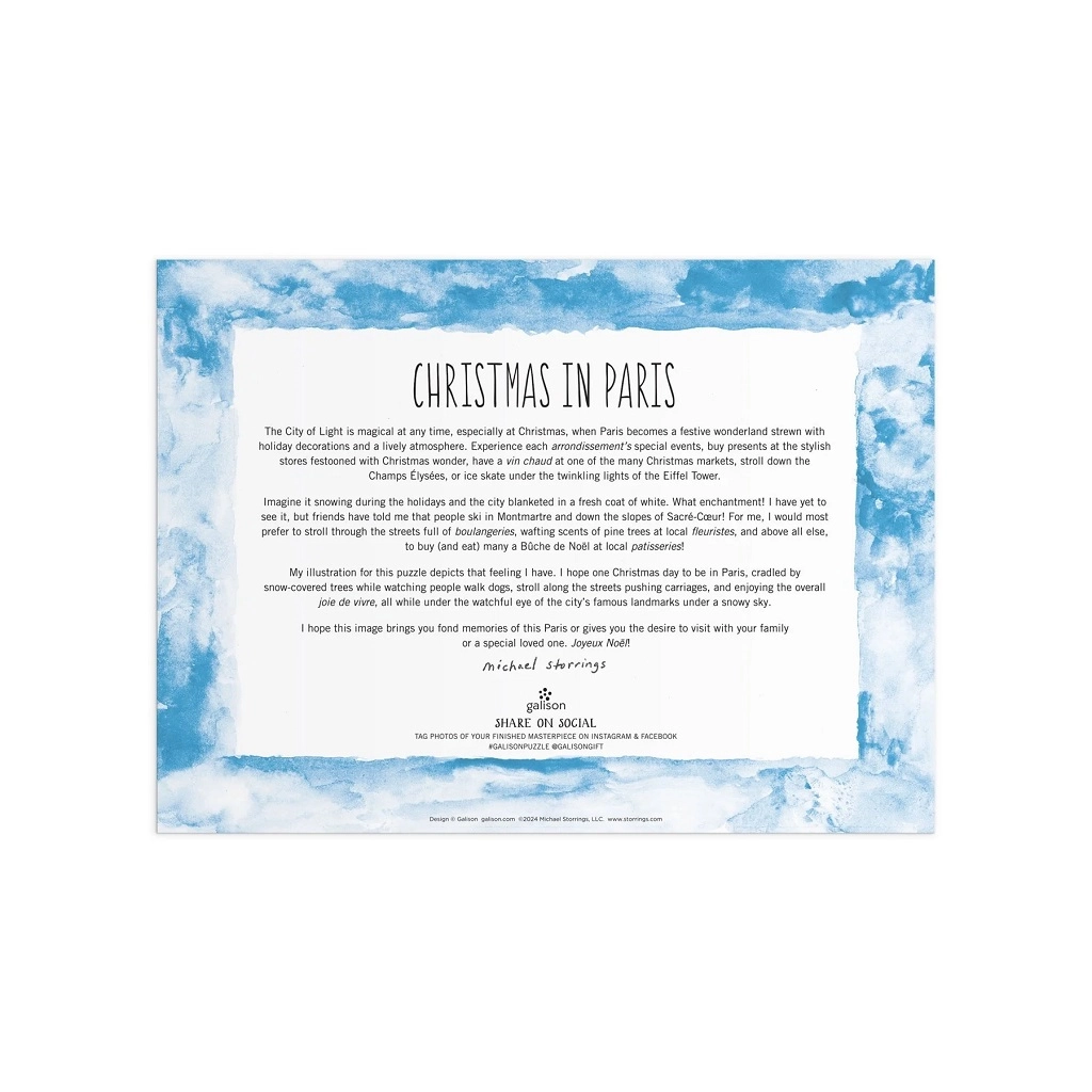 Atklājiet ziemas Parīzes burvību Michaela Storringsa detalizētajā ilustrācijā. Bagātīgi veidotā aina, pilna gaismiņu, veikalu un svētku noskaņas, iepriecinās gan mākslas cienītājus, gan pieredzējušus licējus. Īpašais folijas pārklājums, gaismai krītot, metāliski mirdz un piešķir gatavajam attēlam unikālu, premium izskatu.