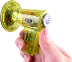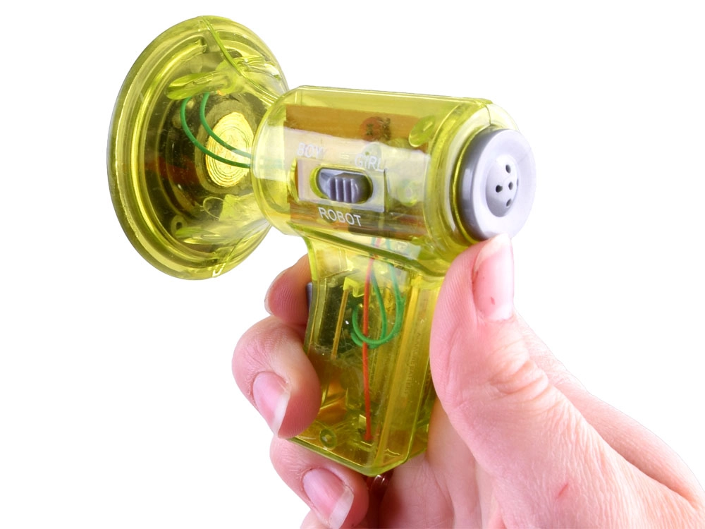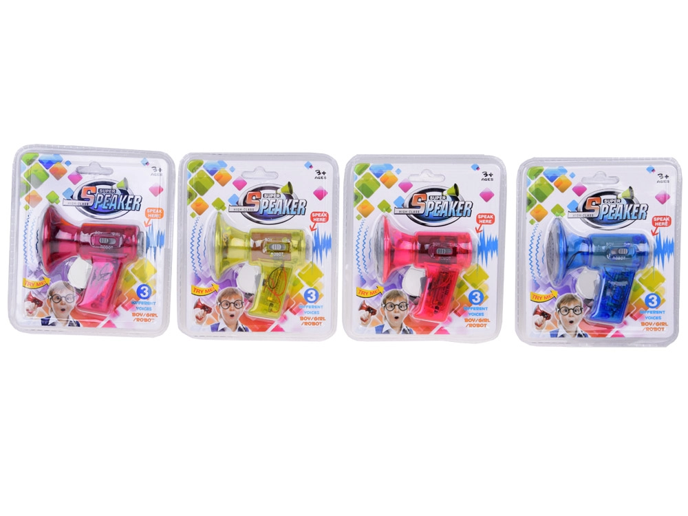 Balss modulators ir pieejams četrās košās krāsās: zilā, dzeltenā, rozā un sarkanā. Katrs var izvēlēties savu iecienītāko krāsu!