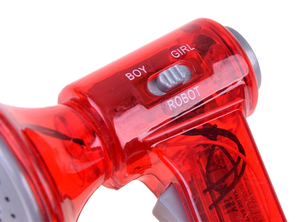 Balss modulators darbojas ar 1x12V bateriju (iekļauta komplektā), un tā ergonomiskais dizains padara to viegli lietojamu pat mazākiem bērniem. Korpuss no vieglas plastmasas nodrošina drošību un ērtu lietošanu.