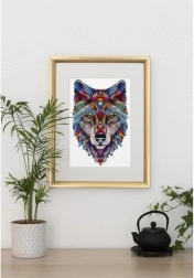 Pēc salikšanas jūs iegūsiet košas krāsas vilka galvu ar bagātīgiem rakstiem, kas kļūs par izteiksmīgu jūsu interjera akcentu.