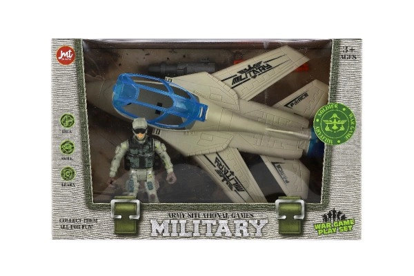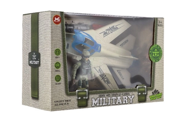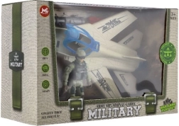 Kastē 27 × 18 × 12 cm ietvertais komplekts satur iznīcinātāju, kareivi un piederumus – lieliska dāvana jaunajiem militāro stāstu cienītājiem.