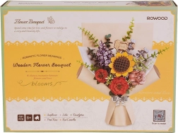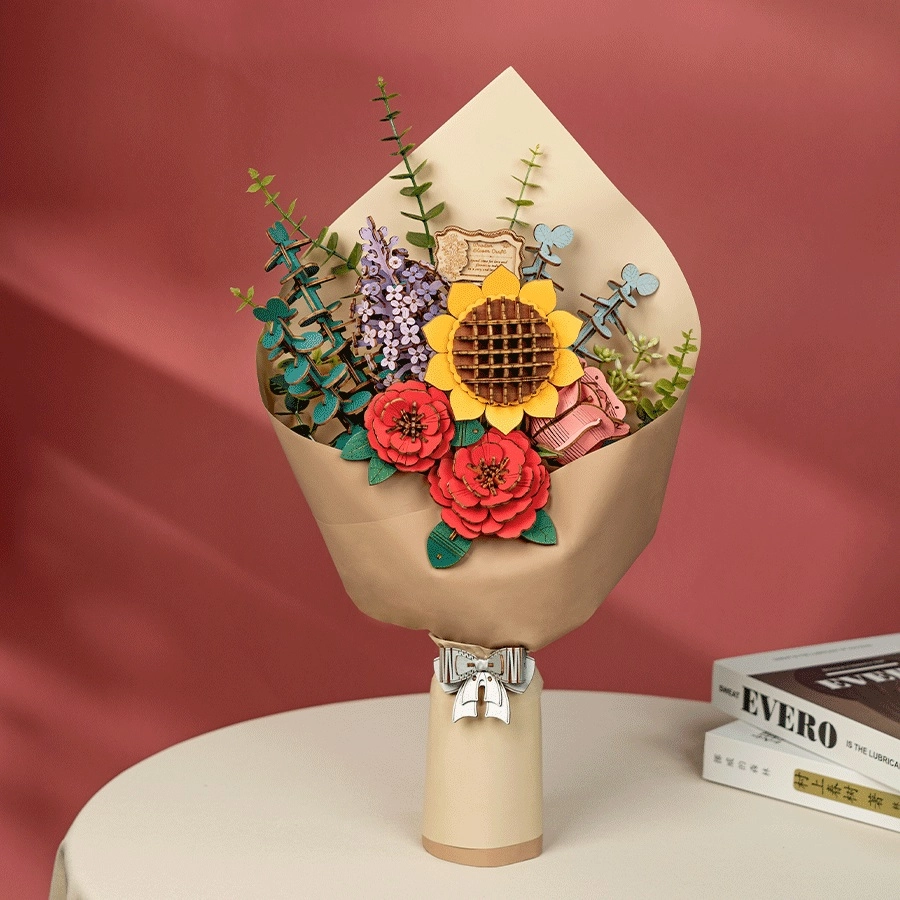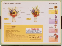 Atklājiet ziedu pušķa burvību, kas nekad nezaudē skaistumu. Koka 3D puzle ietver saulespuķi, ceriņu, sarkano kamēliju, rozā rozi un eikaliptu. Katram ziedam ir regulējams kāta augstums, kas ļauj veidot daudzveidīgus aranžējumus.