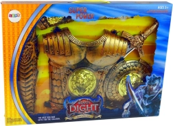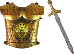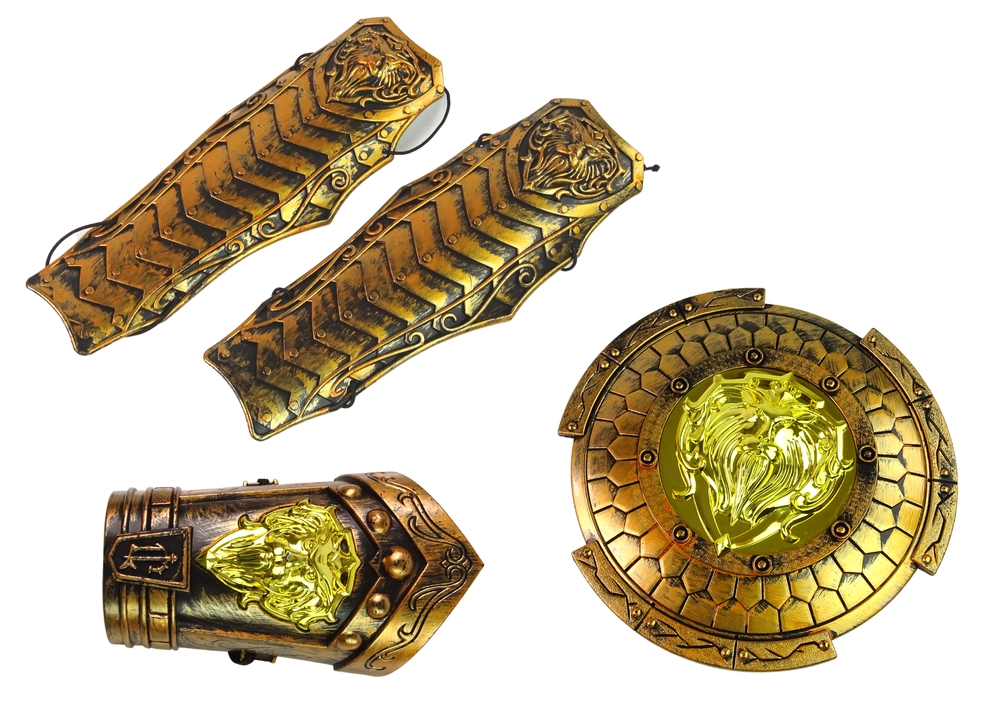 Piedāvājam bērnu bruņinieka kostīmu, kas aizvedīs katru mazo varoni burvīgajā pasaku pasaulē. Zelta bruņas ar tādiem piederumiem kā sargi, vairogs un kronis piešķir bērnam īsta viduslaiku cīnītāja sajūtu. Visas daļas ir izgatavotas no kvalitatīvas un drošas plastmasas, kas nodrošina ilgstošu un drošu rotaļu.