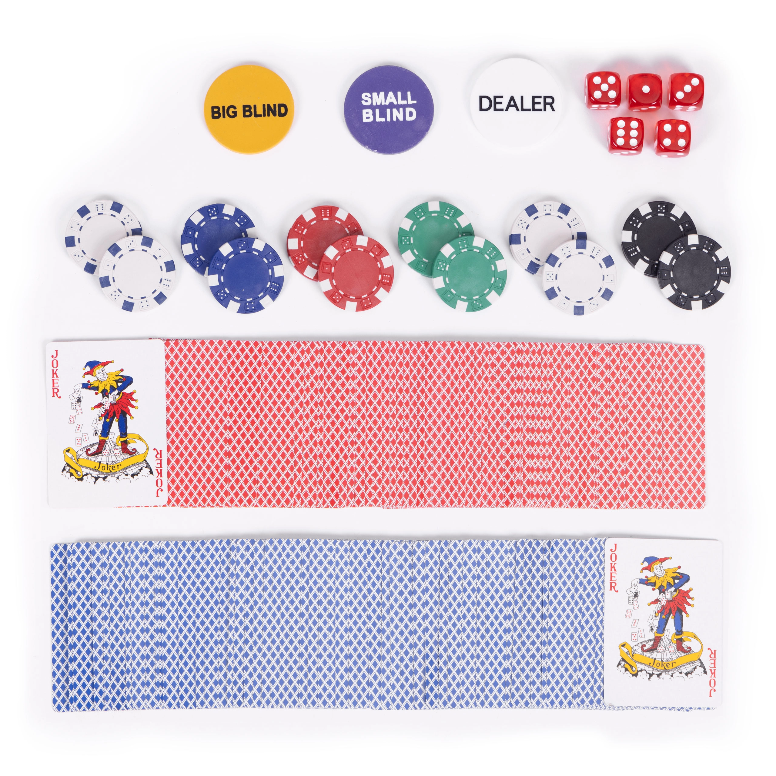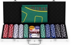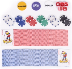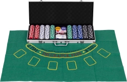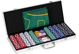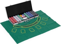 Ietver 500 žetonu, 2 kāršu kavas, kauliņus un spēļu paliktni. Tas viss ērtā, slēdzamā koferī.