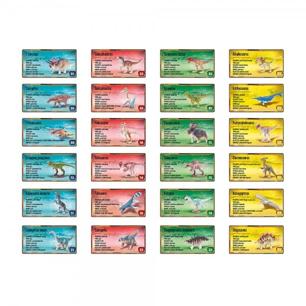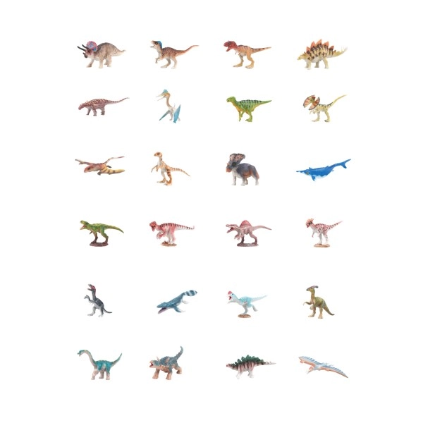 Izveidojiet visu kolekciju ar 24 dažādiem dinozauriem un paplašiniet bērna fantāziju ar piedzīvojumiem no mezozoja laikmeta. Rotaļlietas ir piemērotas bērniem no 3 gadu vecuma, un pateicoties kompaktajiem izmēriem, tās ir ērtas arī ceļojumiem.