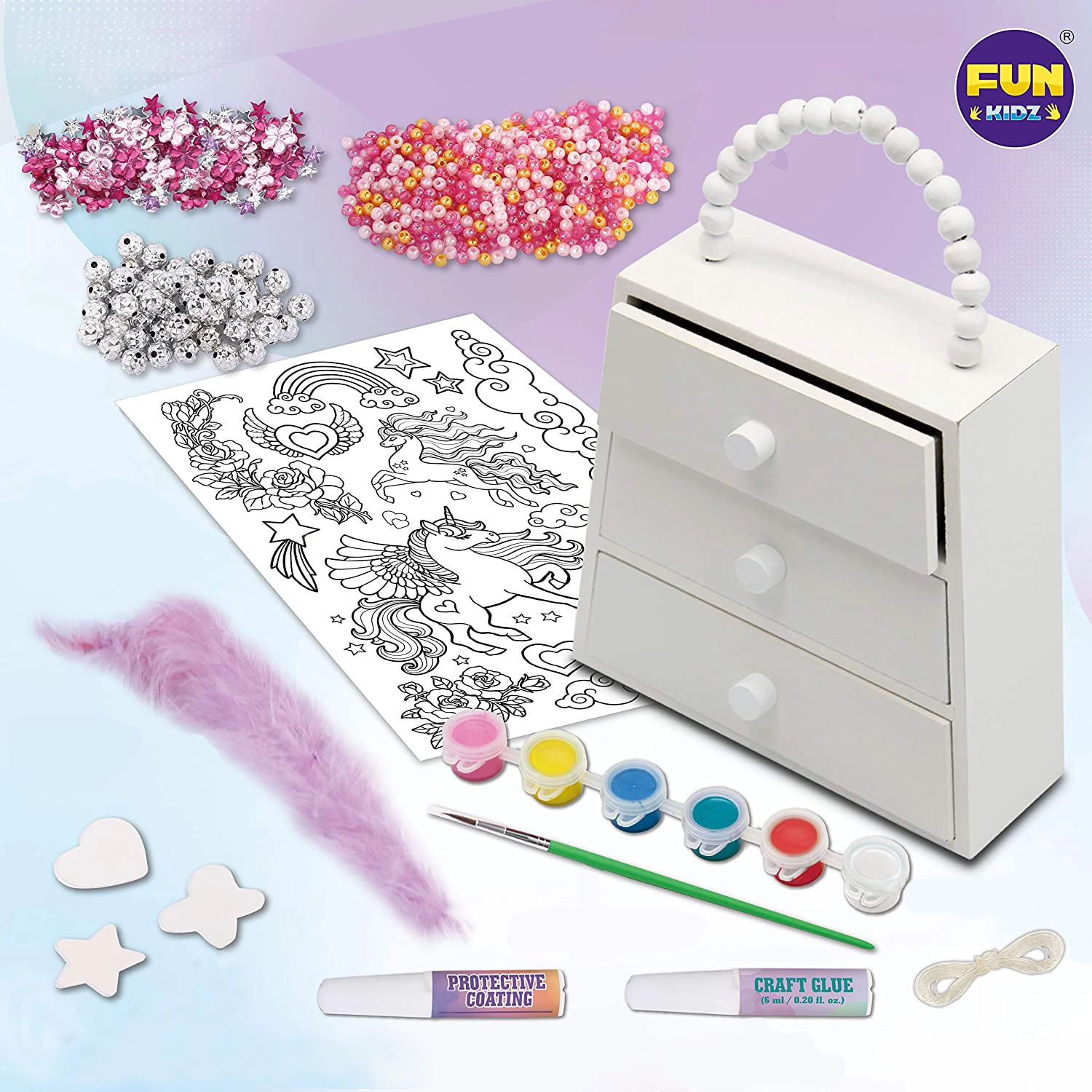 - Komplektā ir koka rotaslietu lādīte, ota, 6 krāsas, aukla, līme un plašs dekorāciju klāsts.