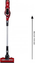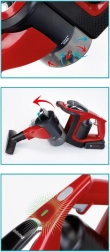 Bērnu putekļsūcējs Bosch Unlimited ir izgatavots sarkanā krāsā ar melniem elementiem un pelēku cauruli, kas nodrošina autentisku izskatu. Tas ir aprīkots ar zaļu LED indikatoru, kas norāda ieslēgšanu, un kustīgu grīdas birstes galviņu ar rotējošu veltni efektīvākai netīrumu savākšanai.