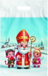 Dekoratīvs polietilēna maisiņš ar Mikulāša, eņģeļa un velniņa apdruku ir ideāli piemērots Mikulāša dāvanu saiņošanai. Izmērs 29×46 cm nodrošina pietiekami daudz vietas saldumiem, rotaļlietām un lielākām dāvanām, priecējot ar košu, jautru motīvu.