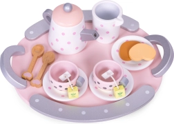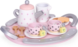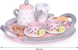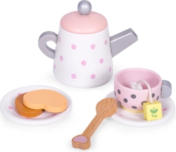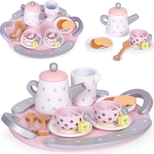 Šis stilīgais ECOTOYS tējas komplekts iepriecinās ikvienu bērnu, kuram patīk uzņemt ģimeni un draugus. Koka trauciņi ar punktiņiem izskatās reālistiski, tāpēc bērni viegli atdarina pieaugušos, pilnveido sociālās prasmes un apgūst galda kultūru. Izturīgais koka izpildījums nodrošina ilgu kalpošanas laiku un drošas spēles.