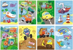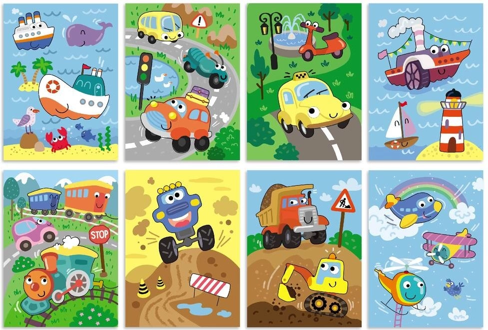 - 8 ilustrētas lapas ar transportlīdzekļiem