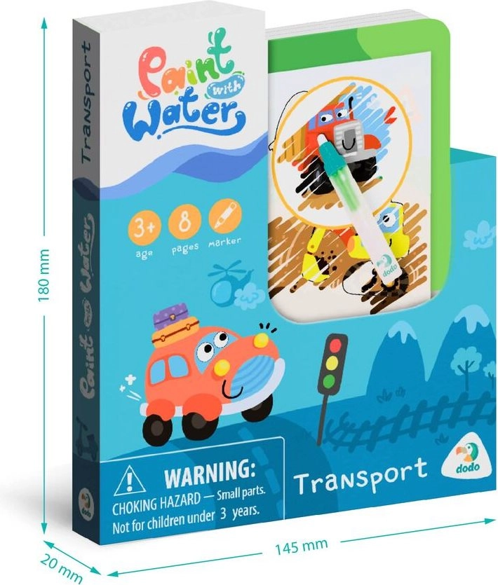Atklājiet nekārtību neradošu izklaidi ar komplektu “Burvīgā gleznošana ar ūdeni – Transports”. Vienkārši piepildiet komplektā iekļauto otiņu ar ūdeni un vērojiet, kā 8 lappušu transportlīdzekļu attēli atdzīvojas. Kad viss nožūst, krāsas pazūd, un grāmatiņu var atkal un atkal izmantot. Ideāli gan ceļā, gan mājās, veicina sīko motoriku un krāsu uztveri. Bez nekārtības, atkārtoti izmantojama, jautra mācīšanās par transportlīdzekļiem.