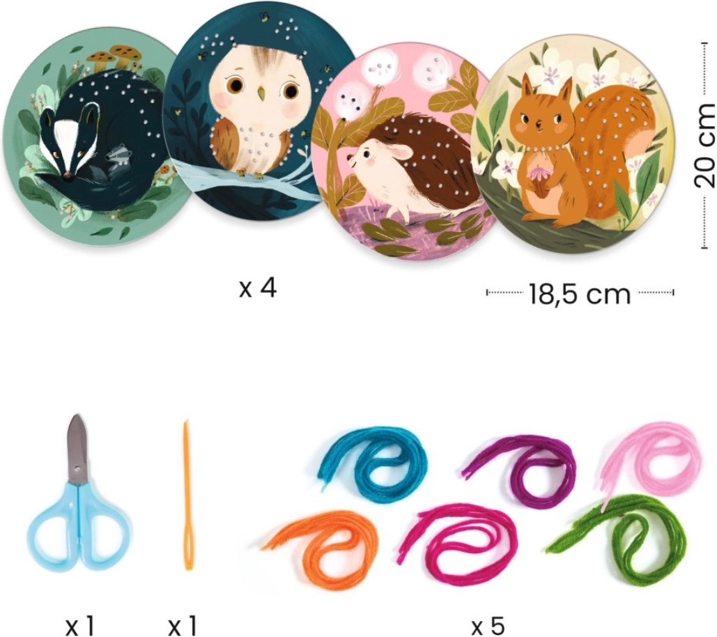 Atklājiet izšūšanas prieku ar radošo komplektu no Djeco gan mazajiem, gan lielajiem iesācējiem. Jūs apgūsiet 2 vienkāršus izšūšanas dūrienus un izveidosiet 4 mīlīgus dzīvnieku attēlus bērnu istabas noformēšanai. Komplekts attīsta sīko motoriku, pacietību un radošo domāšanu un satur visu nepieciešamo, lai sāktu radīt uzreiz.
