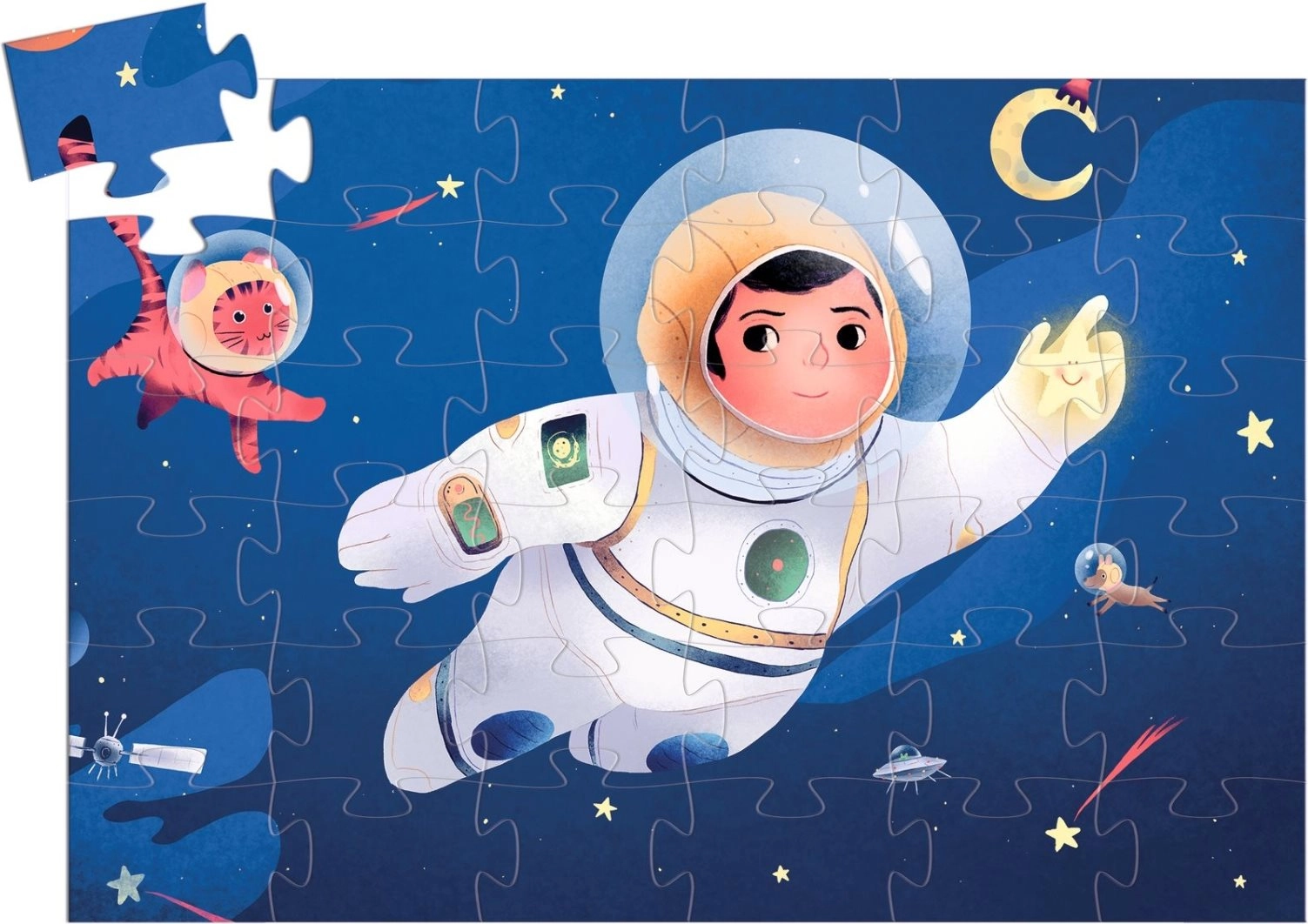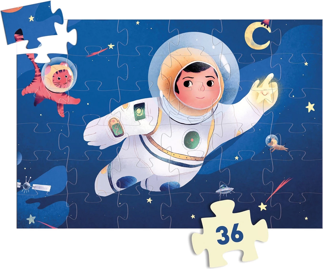Šīs skaisti ilustrētās puzles piedāvā unikālu kosmosa tēmu, kurā astronauts atrodas uz Mēness. Aptuveni 42 x 30 cm lielā puzle ir lielisks veids, kā attīstīt sīko motoriku un telpisko iztēli.