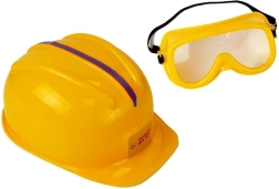 Dzeltenā ķivere un caurspīdīgās brilles sniedz aizsardzības simulāciju drošai un realistiskai spēlei.