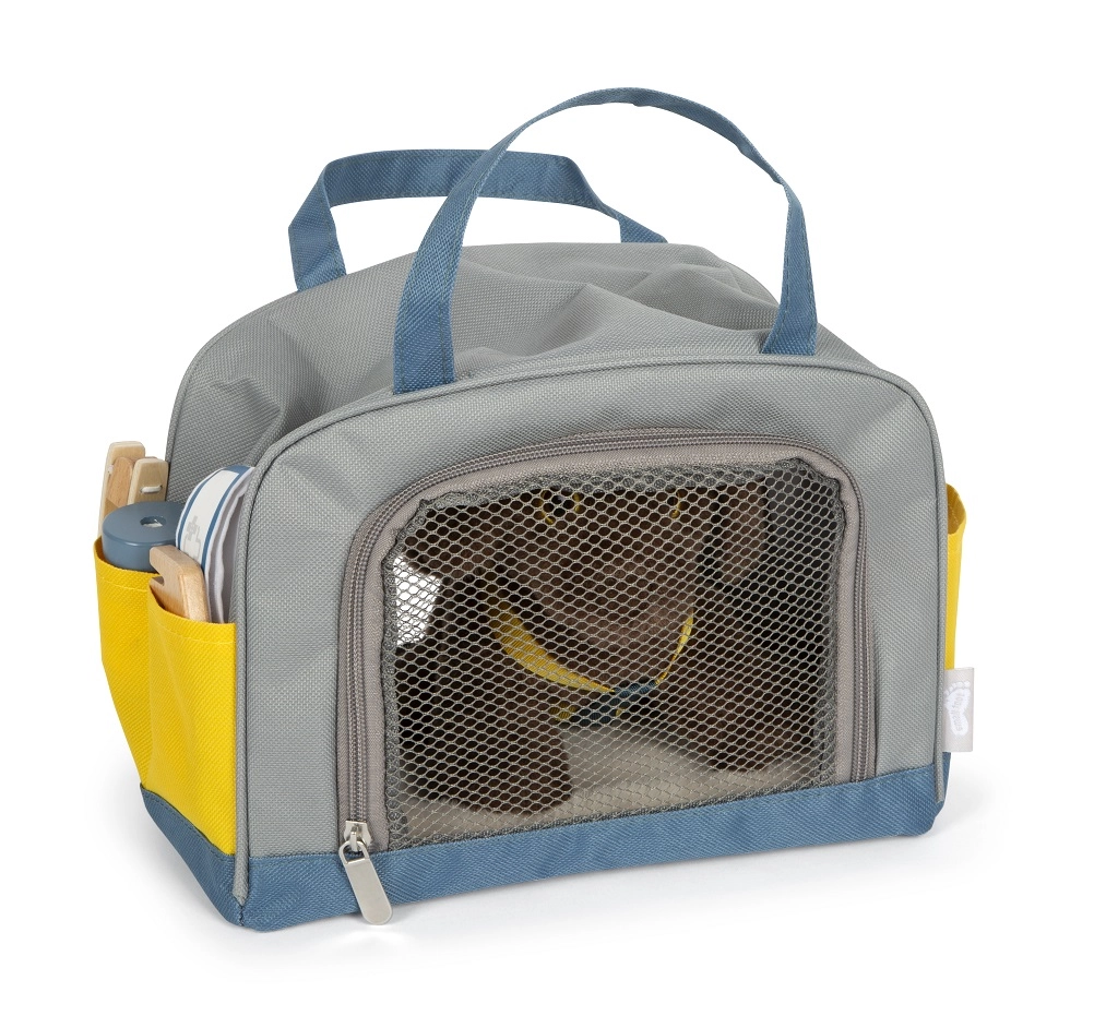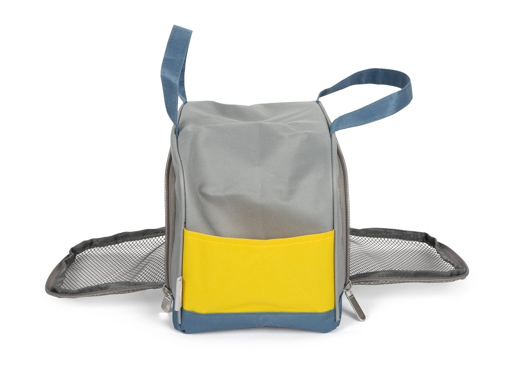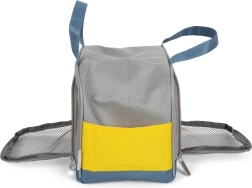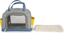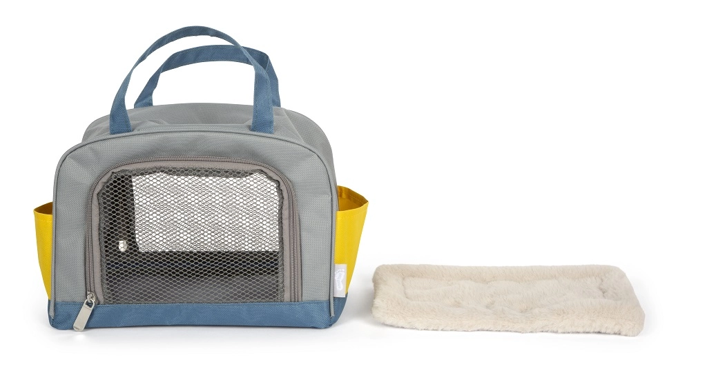 Pelēka un zilā krāsā pārvadāšanas soma ar dubultiem rokturiem un dzeltenām kabatām ir ideāls risinājums mazu mājdzīvnieku pārvadāšanai, nodrošinot jūsu mīlulim komfortu un drošību.