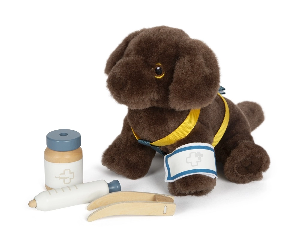 Komplektā ietilpst pūkains suns, pārvadāšanas soma ar mīkstu paliktni, bļodiņa, kārumu trauciņš, pincete, pārsējs, zāļu kārbiņa, rotaļlieta, birste un šļirce ar atsperes mehānismu.
