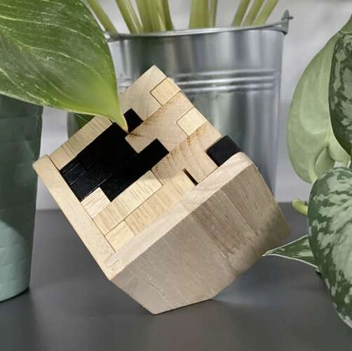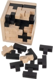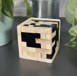 Šis stilīgais koka galvasmežģis dabīgā un melnā toņu salikumā ir ideāls prāta treniņam un kā dizaina akcents uz galda. Komplektā ietilpst rūpīgi apstrādāti, netoksiski “T” veida gabaliņi, kas pareizi salikti veido kompakti krāsās kombinētu kubu. Pateicoties precīzai izgatavošanai, salikšana ir plūdena, patīkama un aizraujoša.